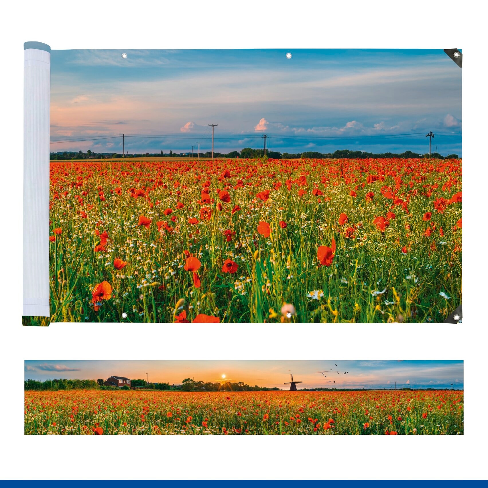 Befestigung: Die Stoffbahnen der Balkonverkleidungen sind an den oberen und unteren Rändern mit Metallösen versehen. Mit Befestigungsschlaufen ähnlich wie Kabelbinder oder mit Kordeln, die du durch die Ösen fädelst, schnürst du sie am Balkongitter fest. Durch die einfache Montage kannst du die Bahnen bei Bedarf mit wenigen Handgriffen auswechseln.
