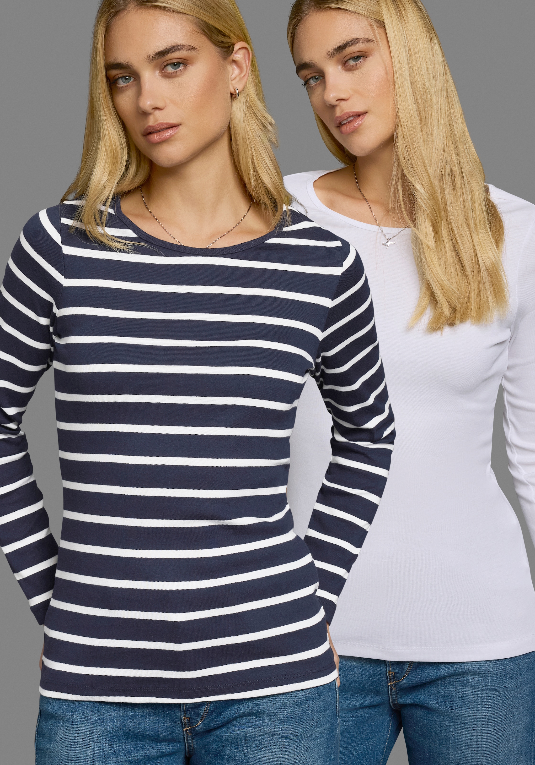 + Farben - Langarmshirt 2er-Pack, Langarm, sehr figurbetonter Schnitt, aus 100% BaumwolleFlashlightsUrsprünglicher PreisUVP 29,99 €Rabatt- 16 %Aktueller Preisab 24,99 €Grundpreis24,99 €pro1 Stk