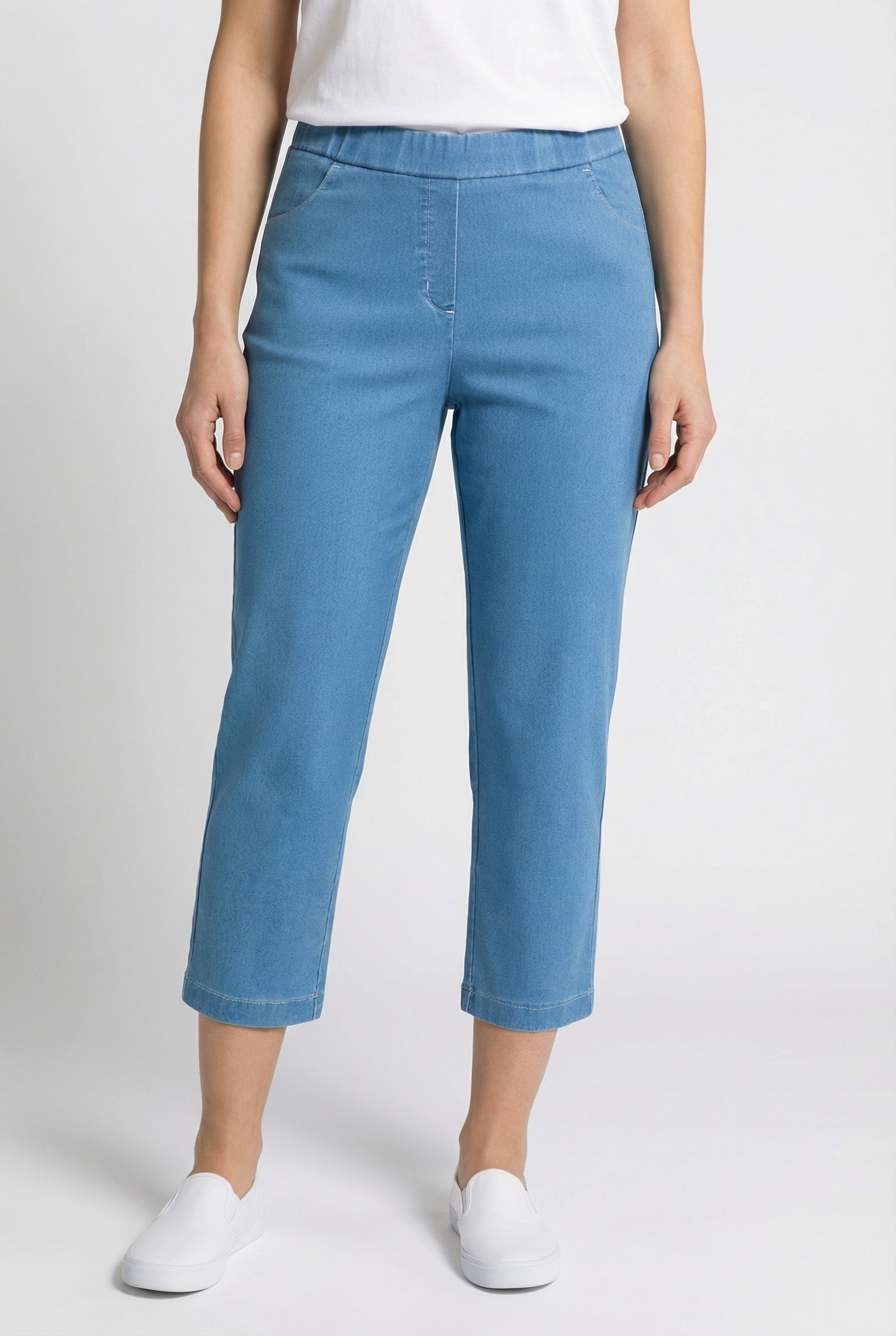 Um schlanken Hüften mehr Kontur zu geben, sind Stretch Jeans mit hellen Waschungen eine gute Wahl. Helle Farben modellieren das Bein und mit kleinen oder gänzlich ohne Gesäßtaschen wird der Po schön in Szene gesetzt.