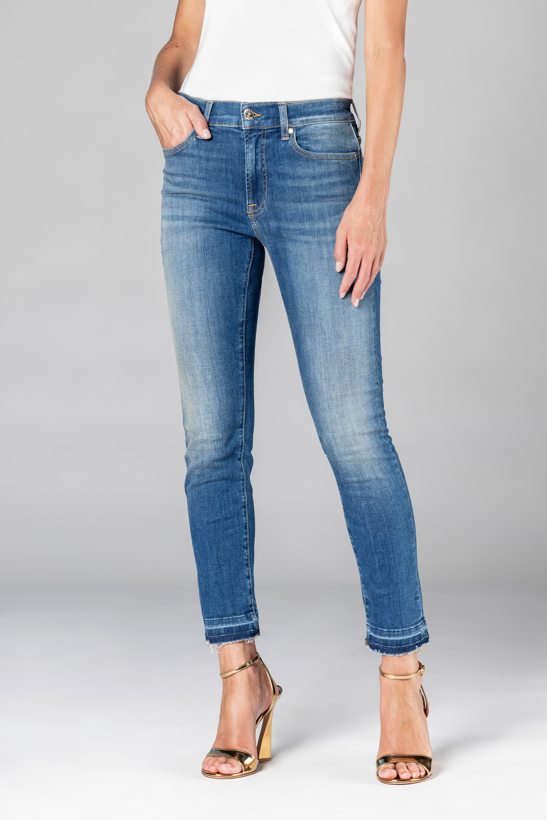 Stretch Jeans mit High-Waist-Schnitt haben eine höhere Taille und kaschieren einen kleinen Bauchansatz. Auch Frauen mit langem Oberkörper können diese Variante der Stretch Jeans gut tragen, um die Figur auszugleichen.