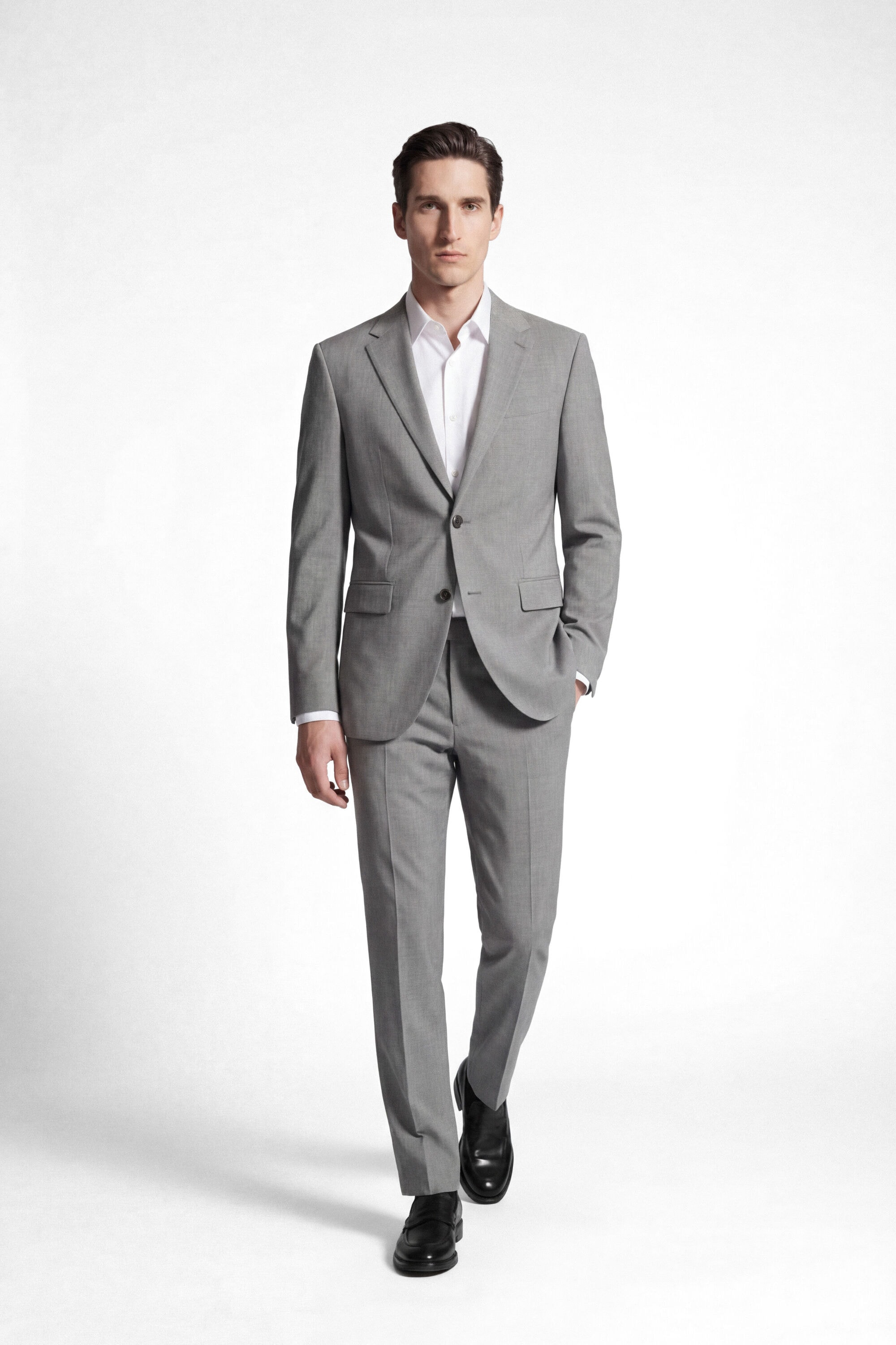 Bei all diesen Passformen fallen als Erstes die Schultern in den Blick. Diese müssen daher perfekt sitzen und zu deinem Körperbau passen. Achte darauf, dass die Ärmel am Handgelenk enden und deine Anzughose leicht auf den Schuhen aufliegt.