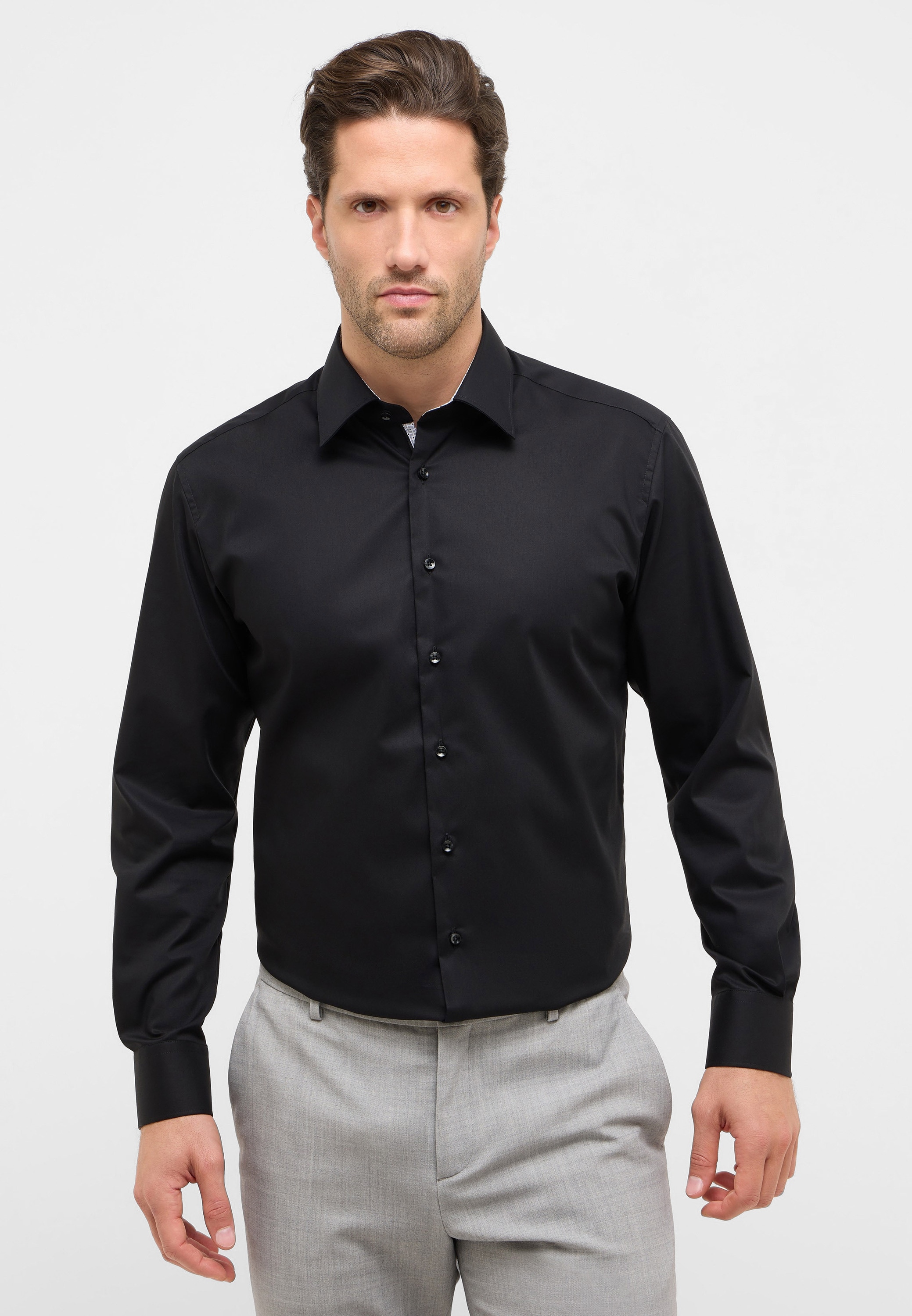 Doch erst die Details formen den Charakter deines Herrenhemds. Der Kragen ist entscheidend: Der Kentkragen gilt als universeller Klassiker, der Haifischkragen wirkt modern und der Button-Down-Kragen betont eine sportliche Lässigkeit.