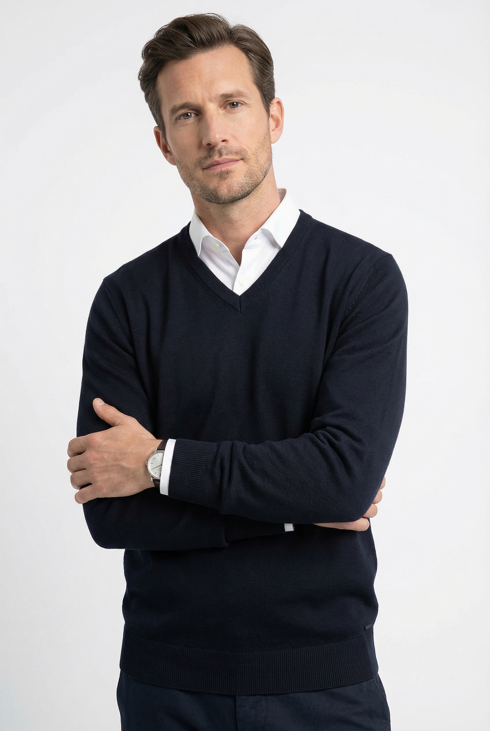 Ein schlichtes Oberteil mit Rundhalsausschnitt ist ein Multitalent. Solo getragen wirkt es lässig, über einem Hemdkragen elegant. Der klassische Rundhals passt gut zu markanten Gesichtszügen, während ein V-Ausschnitt die Halspartie optisch streckt – ideal für rundere Gesichter. Modelle aus feiner Merinowolle oder Baumwolle fühlen sich angenehm an und eignen sich perfekt für den Lagenlook.