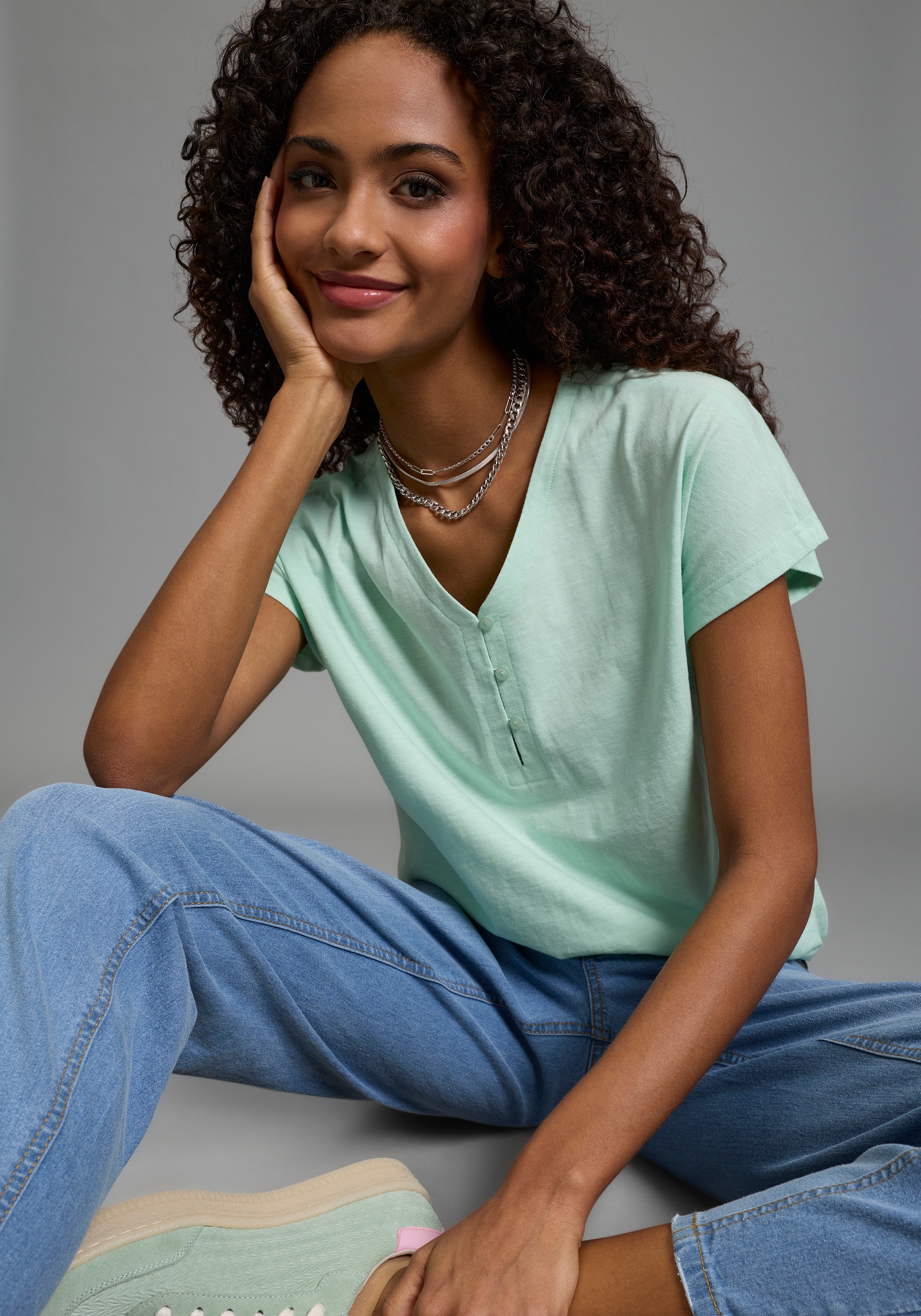 - V-Shirt V-Ausschnitt, mit Knopfleiste, figurumspielende PassformFlashlightsAktueller Preis20,99 €Grundpreis20,99 €pro1 Stk