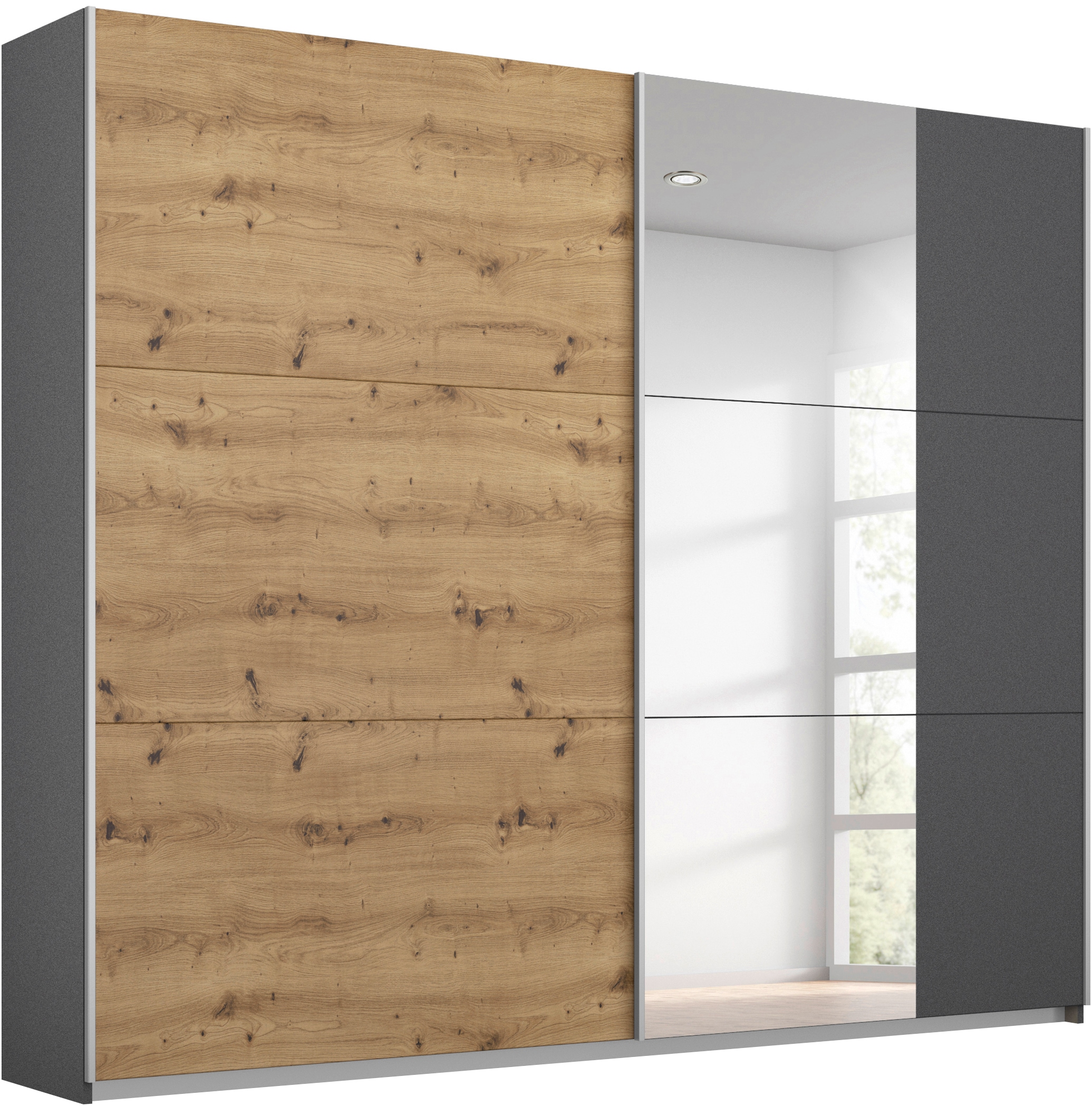 + Farben - Schwebetürenschrank »Kleiderschrank Schrank Garderobe REFLECT« inkl. praktischer...rauchUrsprünglicher PreisUVP 899,00 €Rabatt- 450,09 €Aktueller Preisab 448,91 €