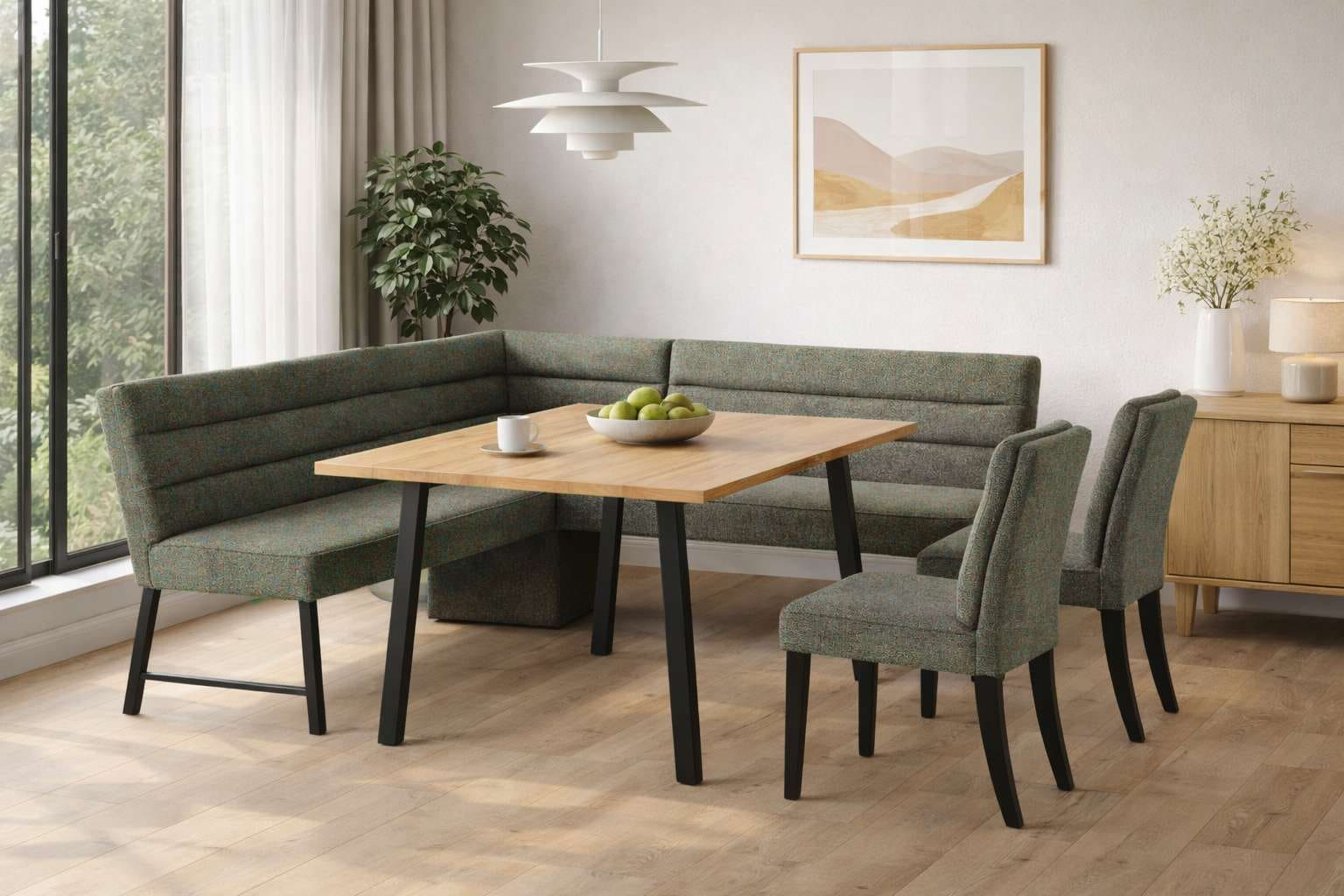 Für ein luftiges Raumgefühl ist auch die Fläche des dazugehörigen Tisches wichtig. Unsere Eckbankgruppen werden meist als Set mit darauf abgestimmtem Tisch angeboten. So bleibt der Raum immer offen und einladend, selbst wenn du zusätzliche Stühle nutzt.