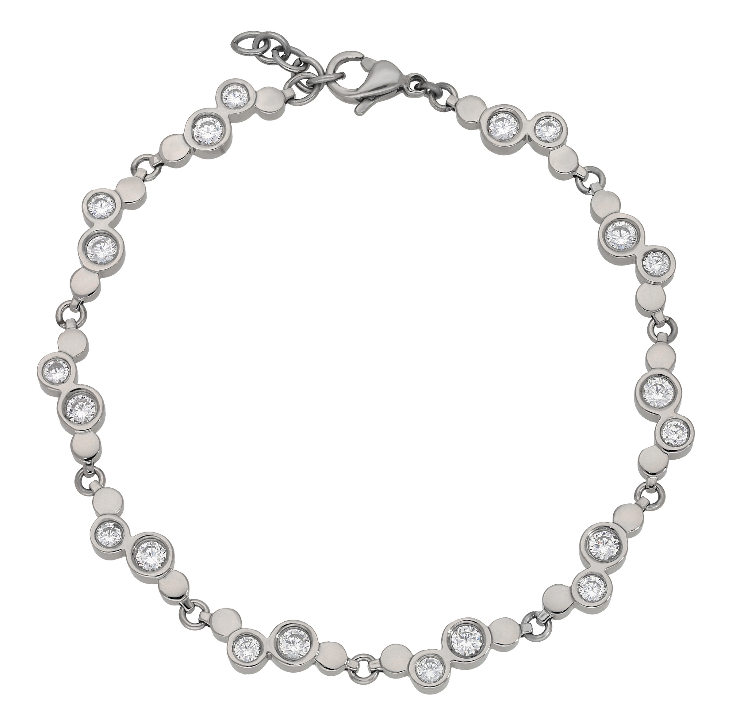 Dieses traumhaft schöne Armband besteht aus Titan. Das Armband ist insgesamt 20 cm lang und verfügt über eine 4 cm lange Verlängerung. Mittels Karabinerverschluss kann die Länge nach Belieben variiert werden. Das Armkettchen setzt sich aus zehn Schmuckgliedern zusammen, die wiederum jeweils durch zwei glänzend polierte und zwei mit Zirkonia besetzte runde Elemente gebildet werden. Das Armband wirkt am Armgelenk ausgesprochen elegant und veredelt Ihren Look gekonnt.
