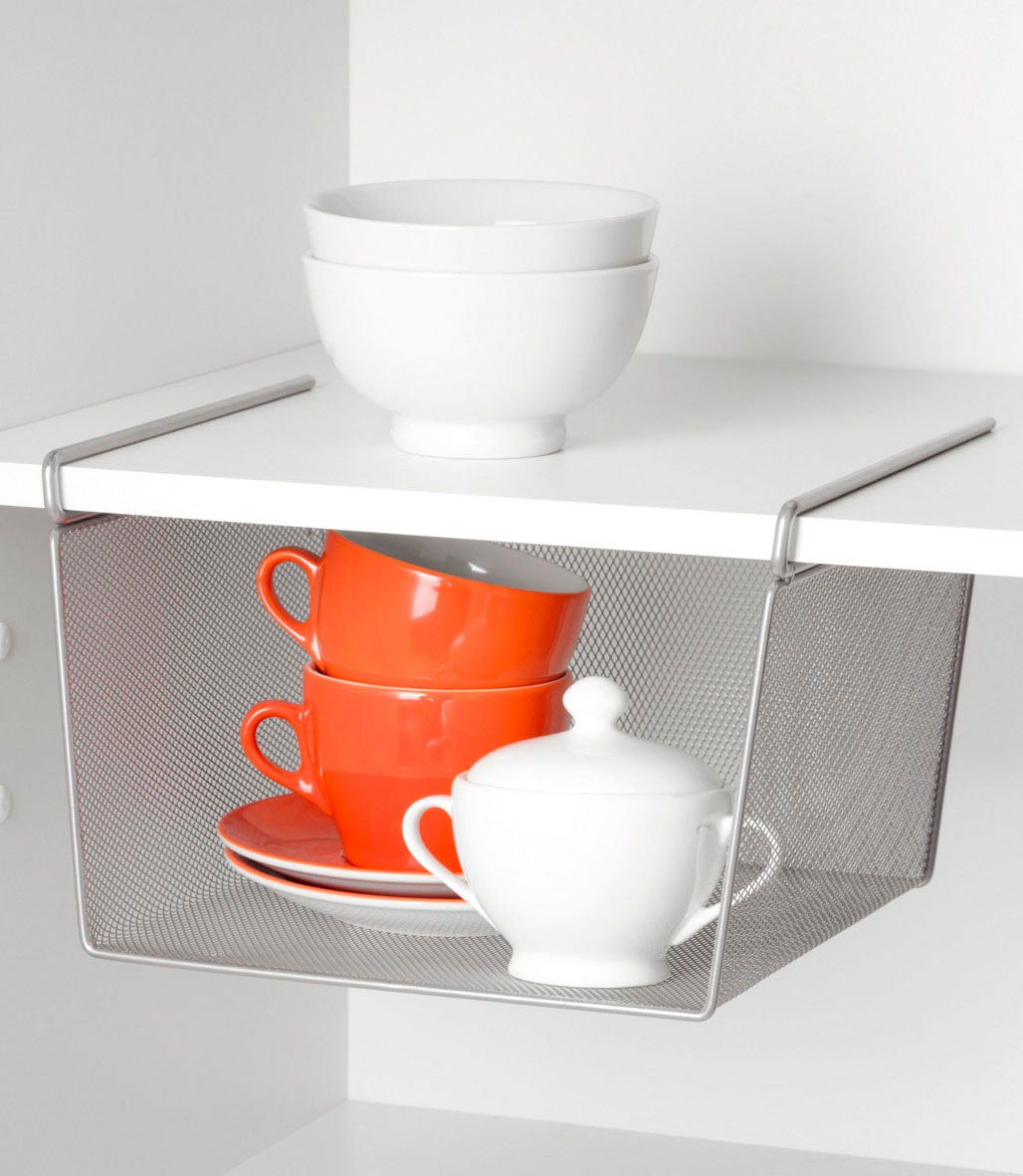 Ein echtes Ordnungswunder! Mit diesem praktischen Unterregal von Zeller Present gewinnt man wertvollen, zusätzlichen Stauraum in großen Schränken mit wenig Böden. Hergestellt wurde das praktische Regal aus robustem Metallgeflecht und eignet sich ideal zur Ablage von Handtüchern im Badzimmer oder verschiedenen Unterlagen im Büro. Das stabile Mesh-Körbchen ist an drei Seiten geschlossen und sorgt so dafür, dass nichts herunter oder herausfallen kann. Schneller und einfacher lässt sich zusätzlicher Stauraum nicht finden! Das kleine Regal wird einfach mittels der Halterung an einem Regalboden befestigt.