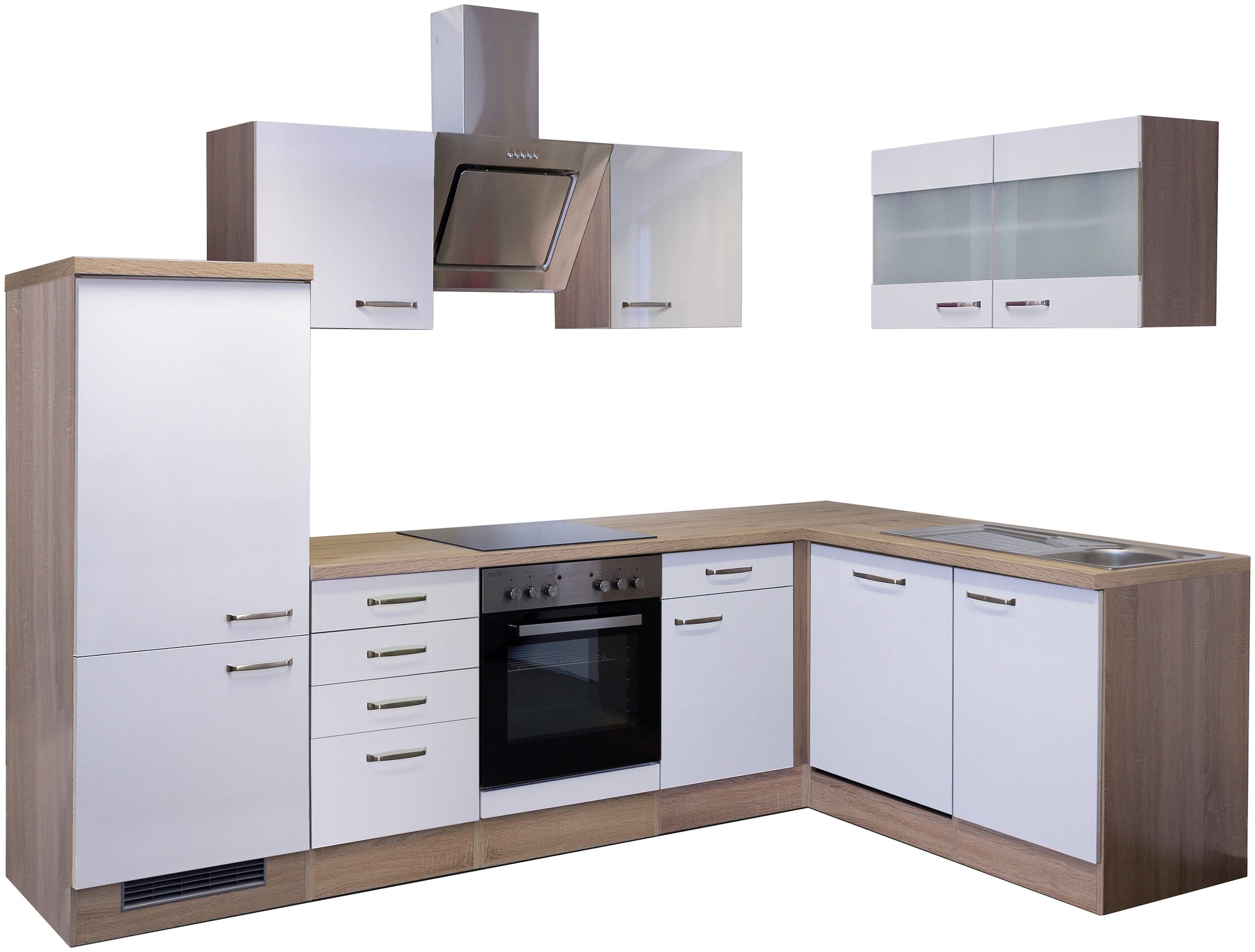 Wissenswertes  | Produktdetails Gesamtbreite: 280 cm Schenkellänge links: 280 cm Schenkellänge rechts: 170 cm Türanschlag: beliebig Material: Holzwerkstoff melaminbeschichtet Frontstruktur: glänzend, matt Korpusdekor: eichefarben sonoma Arbeitsplattendekor: eichefarben sonoma Griffe: Bügelgriff edelstahlfarbig Sockelhöhe: 13,6 cm, nicht verstellbar Lieferhinweis: Ohne Dekoration und Armatur. Selbstmontage mit Aufbauanleitung. Setdetails 2 Hängeschränke Maße (B/T/H): 50/32/55 cm Anzahl Türen: 1 Anzahl Einlegeböden: 1 Hängeschrank Maße (B/T/H): 100/32/55 cm Anzahl Türen: 2 Anzahl Einlegeböden: 1 Unterschrank Anzahl Auszüge: 1 Auszugsinnenmaß (B/T/H): 43,4/45/8 cm Maße (B/T/H): 50/57/82 cm Anzahl Schubladen: 3 Schubkasteninnenmaß (B/T/H): 43,6/40/7,5 cm Eckunterschrank Maße (B/T/H): 110/57/82 cm Anzahl Schubladen: 1 Schubkasteninnenmaß (B/T/H): 43,6/4  |
