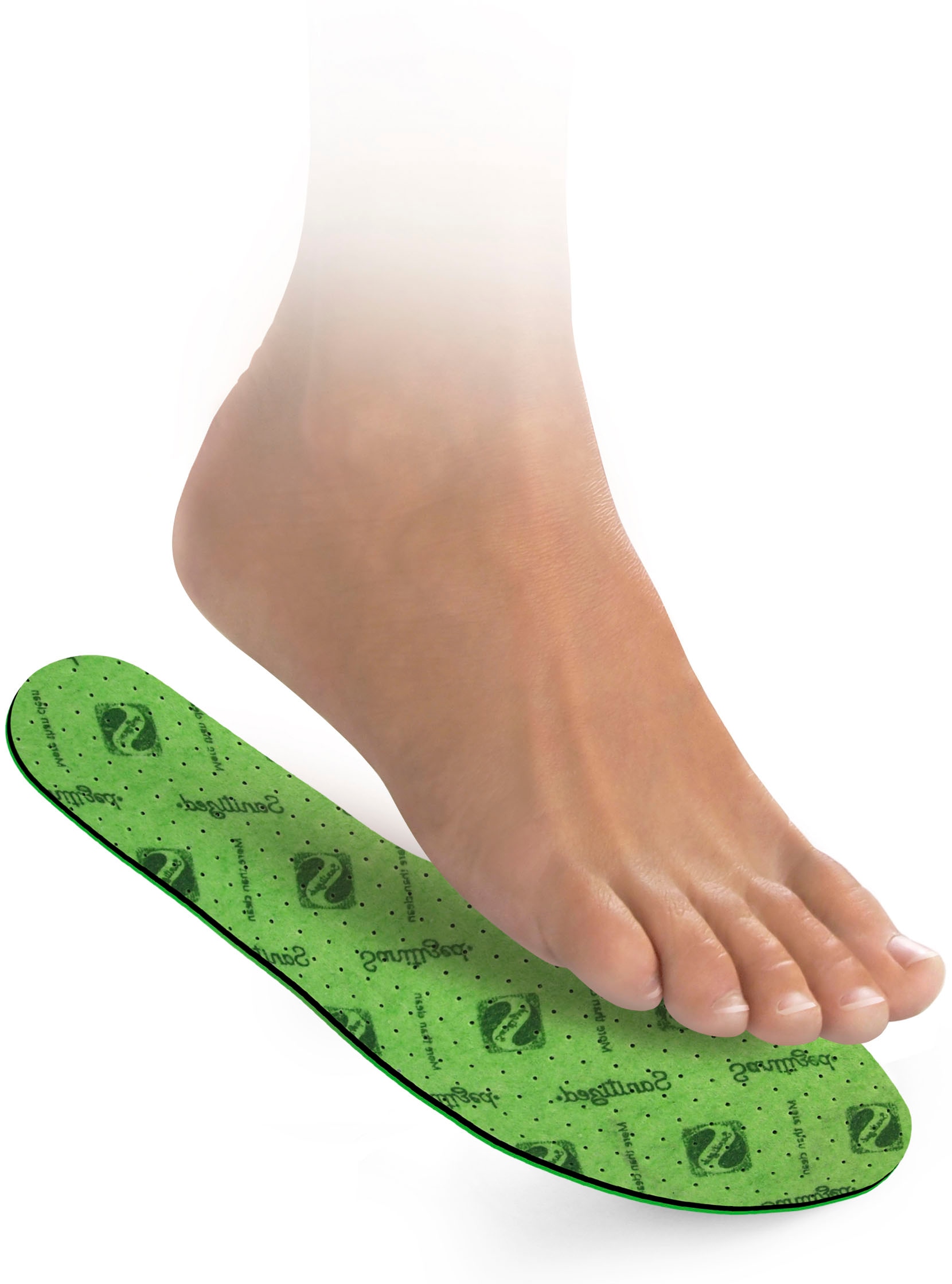 Die Grün & Frisch Sohlen sorgen für ein sehr angenehmes Laufgefühl. Sie dämpfen das Auftreten und versprechen bequemen Komfort bei jedem Schritt. Gefertigt aus atmungsaktivem Material, unterstützen diese Sohlen ein gesundes Fußklima und gewähren aufgrund der integrierten Perforation eine gute Luftzirkulation. Zusätzlich sind die Sohlen mit einem langanhaltenden und angenehmen Duft versehen, der eine antibakterielle Frische bietet und präventiv vor Fußpilz schützt. Dank markierter Schneidlinien können Sie die Einlegesohlen einfach auf Ihre Schuhgröße zuschneiden.