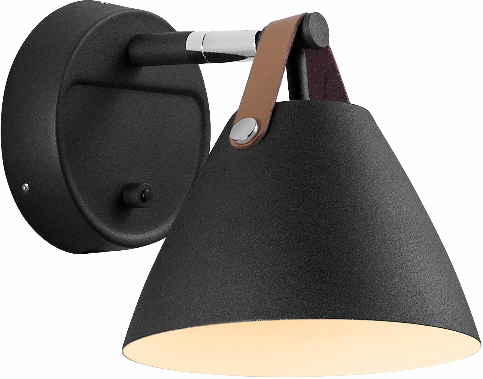 Strap ist ein nordischer Design Klassiker. Die Wandleuchte besticht durch Ihre Kombination aus Metall Schirm, Metall Gestell und Leder Applikation an der Aufhängng. Strap hat einen An/ Aus Schalter am gehäuse. Die Leuchte kann über as mitgelieferte Netzkabel betrieben werden, aber auch ohne Kabel an die Wand montiert werden.
