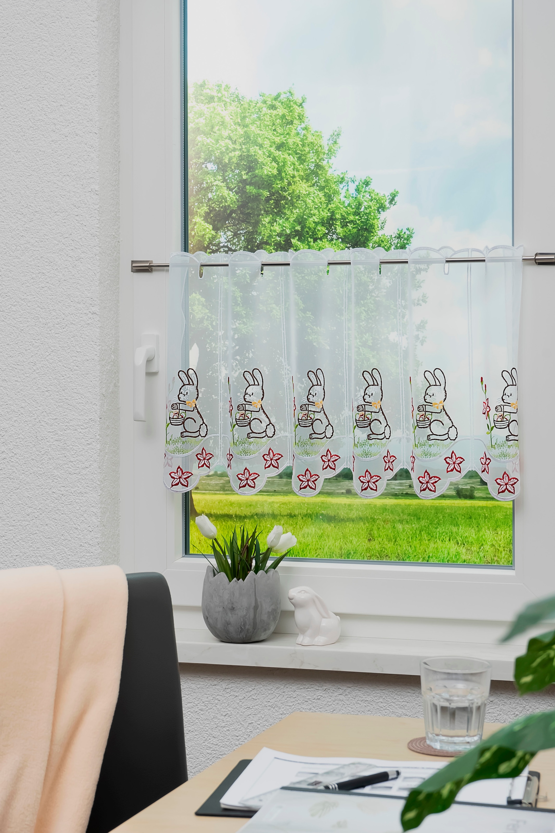 - halbtransparenter Stoff dämpft einfallendes Licht und bietet einen leichten Sichtschutz
