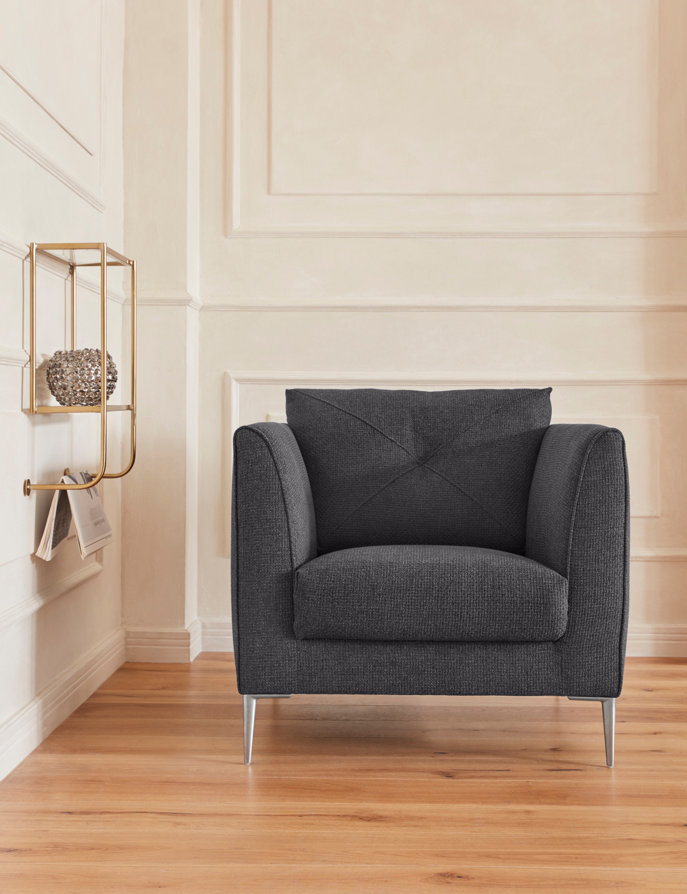 Wissenswertes | Elegante Kreuznaht im Rückenkissen, softer Sitzkomfort, in verschiedenen Farben und Stoffen erhältlich, extra hohe Füße aus Metall |