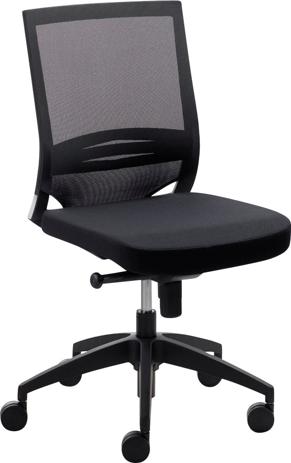 Stoffpolstersitz schwarz, Netzrücken, höhenverstellbare Lendenwirbelstütze, Synchronmechanik mit individueller Gewichtseinstellung, Kunststoff-Fußkreuz schwarz, inkl. große Rollen für Teppichböden, getestet nach Bürostuhlnorm EN 1335 1-3. 3 Jahre Garantie.