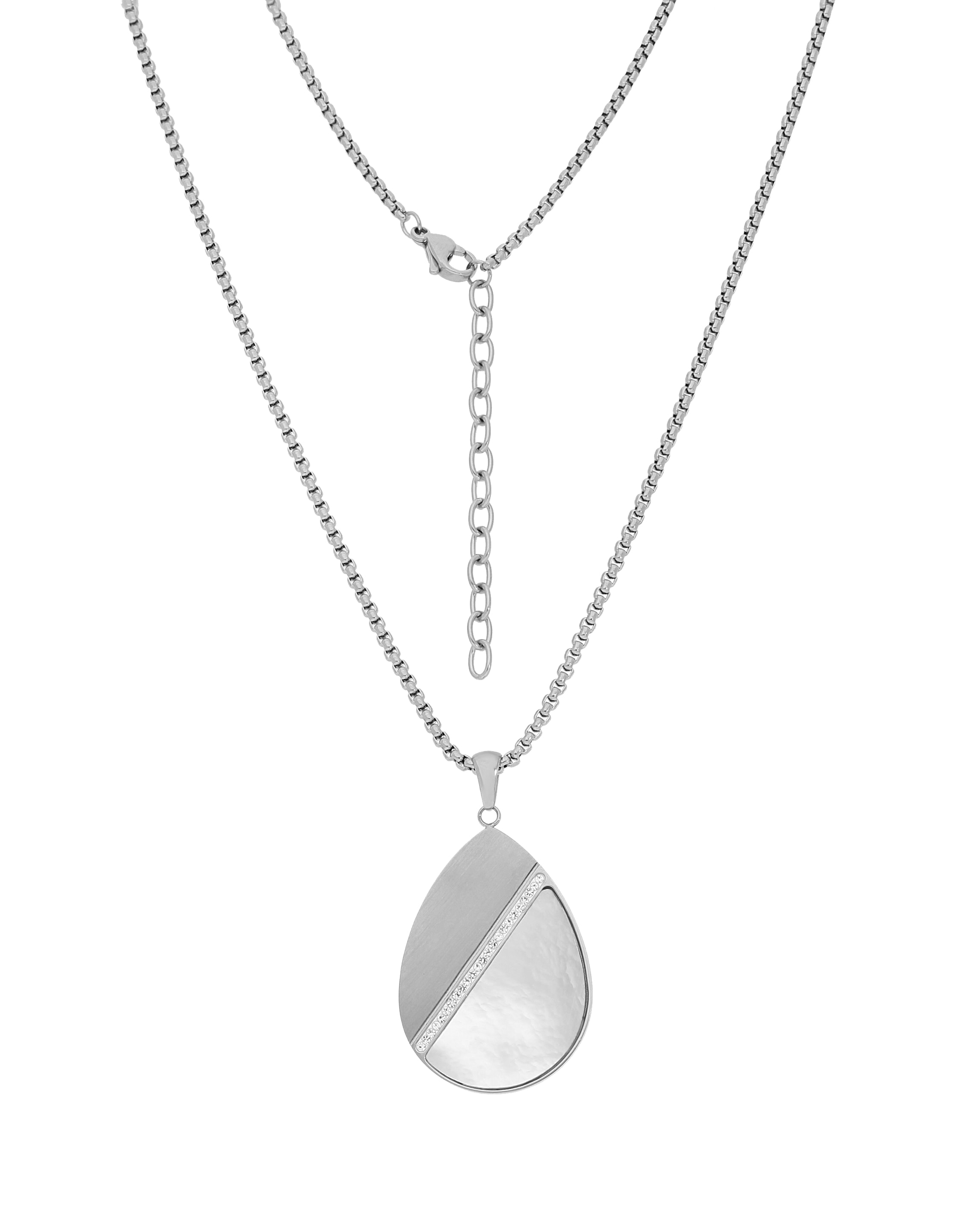 Diese bezaubernde Kette mit Anhänger sieht bei allen modebewussten Frauen sehr schick aus. Die 1,6 mm starke Venezianerkette besteht aus silberfarbenem Chirurgenstahl. Sie ist 45 cm lang und hat eine ca. 5 cm lange Verlängerungsoption, die ein Variieren der Kettenlänge ermöglicht. Der abnehmbare tropfenförmige Anhänger besteht ebenfalls aus Edelstahl, wobei die Vorderseite satiniert und die Rückseite glänzend poliert ist. Er wird auf der Hauptansichtsseite durch einen wunderschön funkelnden Streifen weißer Kristalle auf weißer Klebemasse sowie einen weißen Perlmutt-Inlay verziert. Der Anhänger hat eine Breite von 2,45 cm, eine Länge von 3,40 cm und eine Stärke von 1,35 mm. Dieses Schmuckstück lässt Sie bei jedem Anlass glänzen.