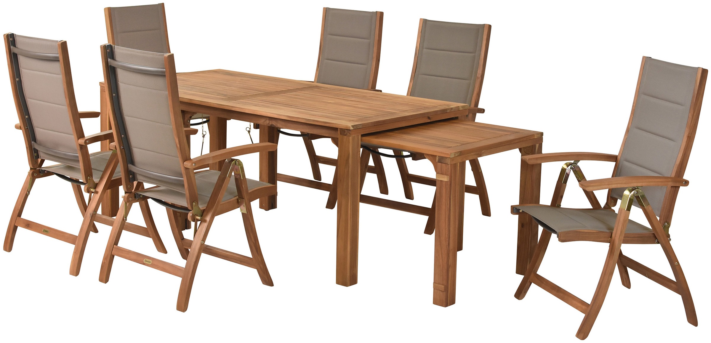 Bei diesem Anblick im Garten werden deine Nachbarn große Augen machen. Das Gartenmöbelset »Schloßgarten« von Merxx bringt ein stilvoll anmutendes Flair in den Außenbereich. Die Sitzplätze auf den Stühlen und der Gartenbank sind für vier Personen ausgelegt. Damit kannst du in gemütlicher Runde unter Freunden und mit Familie einen sonnigen Nachmittag bei dir draußen hinter dem Haus genießen. Mit Snacks und kühlen Getränken auf dem großzügigen Tisch steht alles für entspannte Stunden bereit. Möchtest du üppiger auftischen, dann nutze die praktische Erweiterungsfunktion des ausziehbaren Gartentischs. Hochwertige Stahlgestelle geben der Sitzgruppe einen guten Stand. Einen natürlichen Charme bringt das FSC®-zertifizierte Hartholz ins Spiel. Tischplatte, Sitzflächen und Rücken- sowie Armlehnen sind daraus hergestellt. Die Stühle sind platzsparend zusammenklappbar. An lauen Sommerabenden ist das Merxx Gartenmöbelset »Schloßgarten« dein persönlicher Treffpunkt für gesellige Runden.
