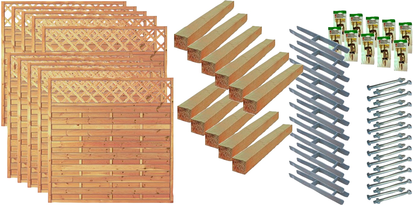 Lieferumfang | 6 Elemente 180x80 cm; 7 Pfosten 9x9x110 cm Kopf Bischofsmütze; 7 H-Pfostenträger, 6 Pakete L-Beschläge mit Schrauben; 7 Pakete Durchgangsschrauben. |