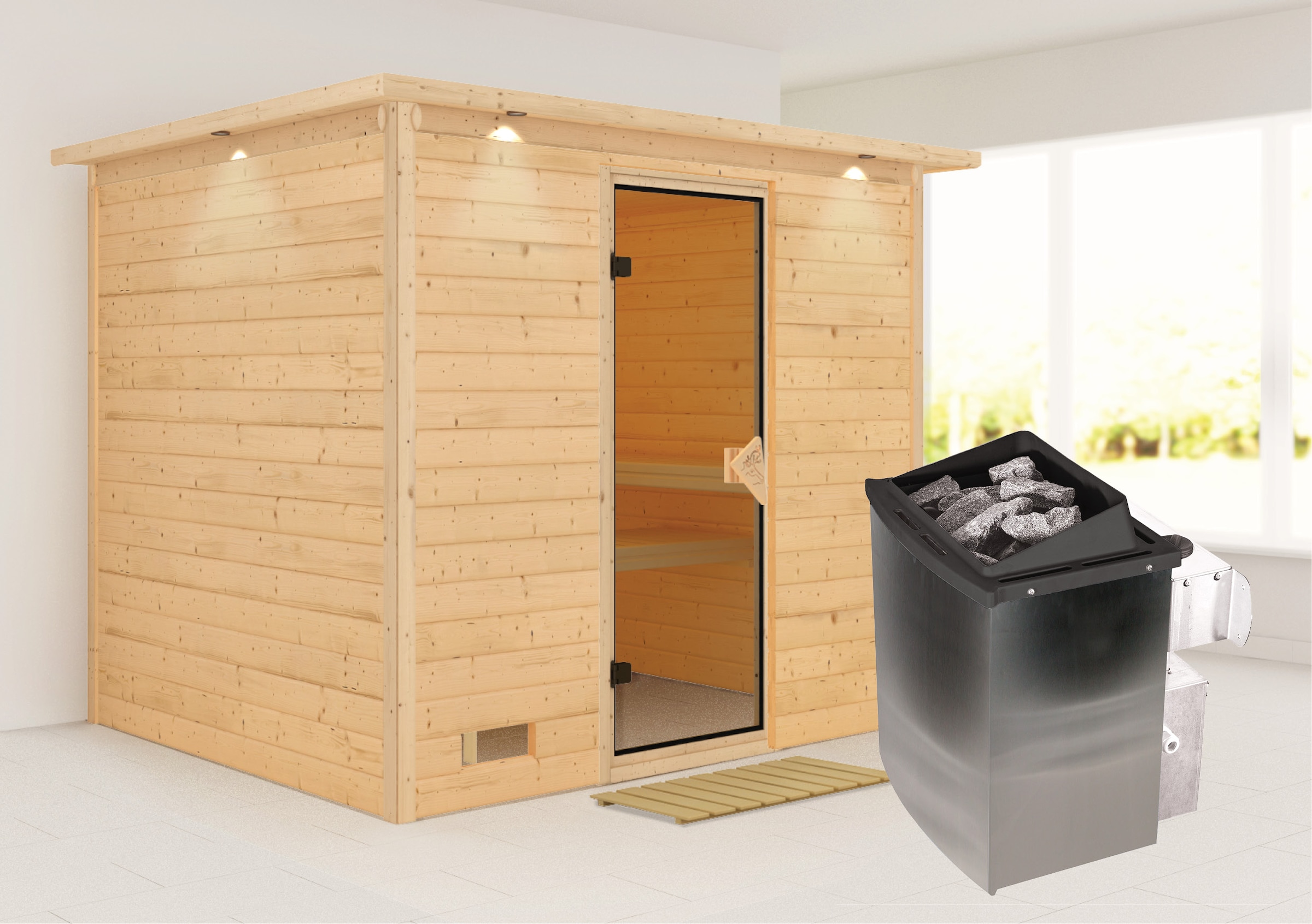 - Inklusive rechts und links anschlagbarer Saunatür