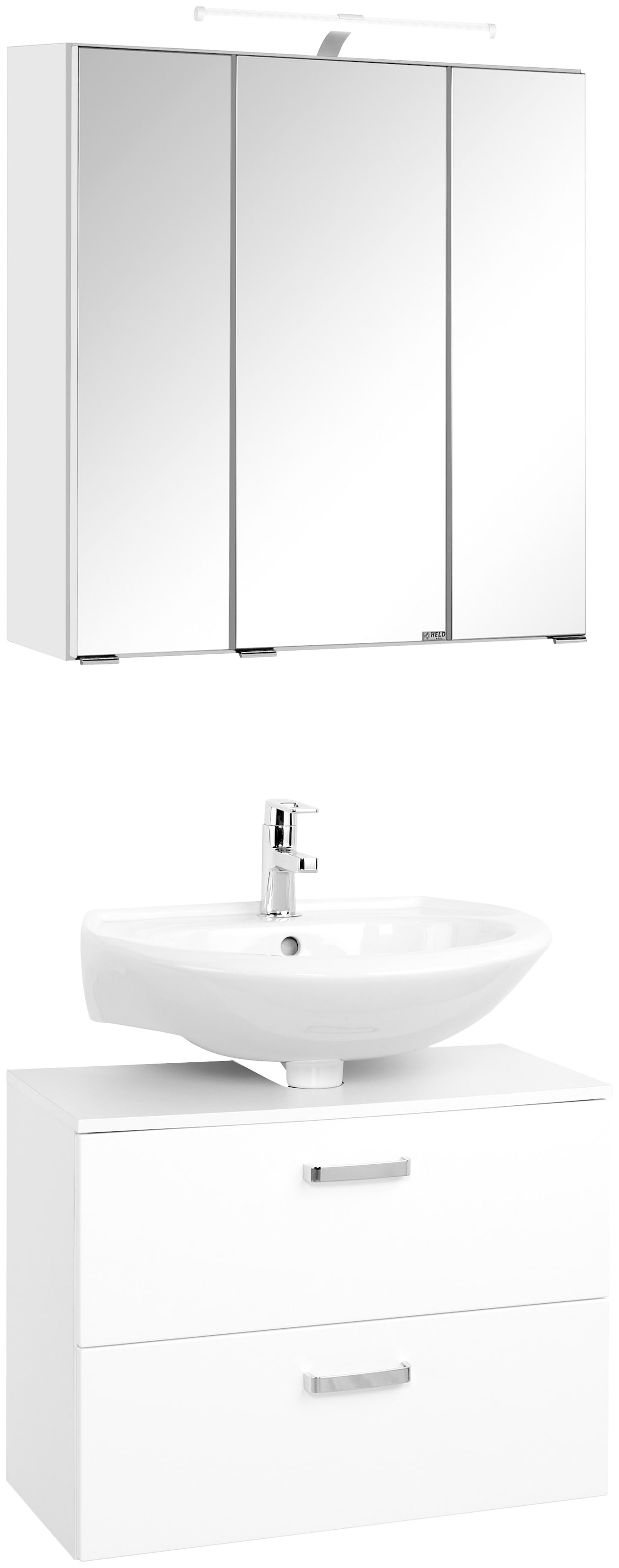 - Bestehend aus 3D-Spiegelschrank und Unterbeckenschrank