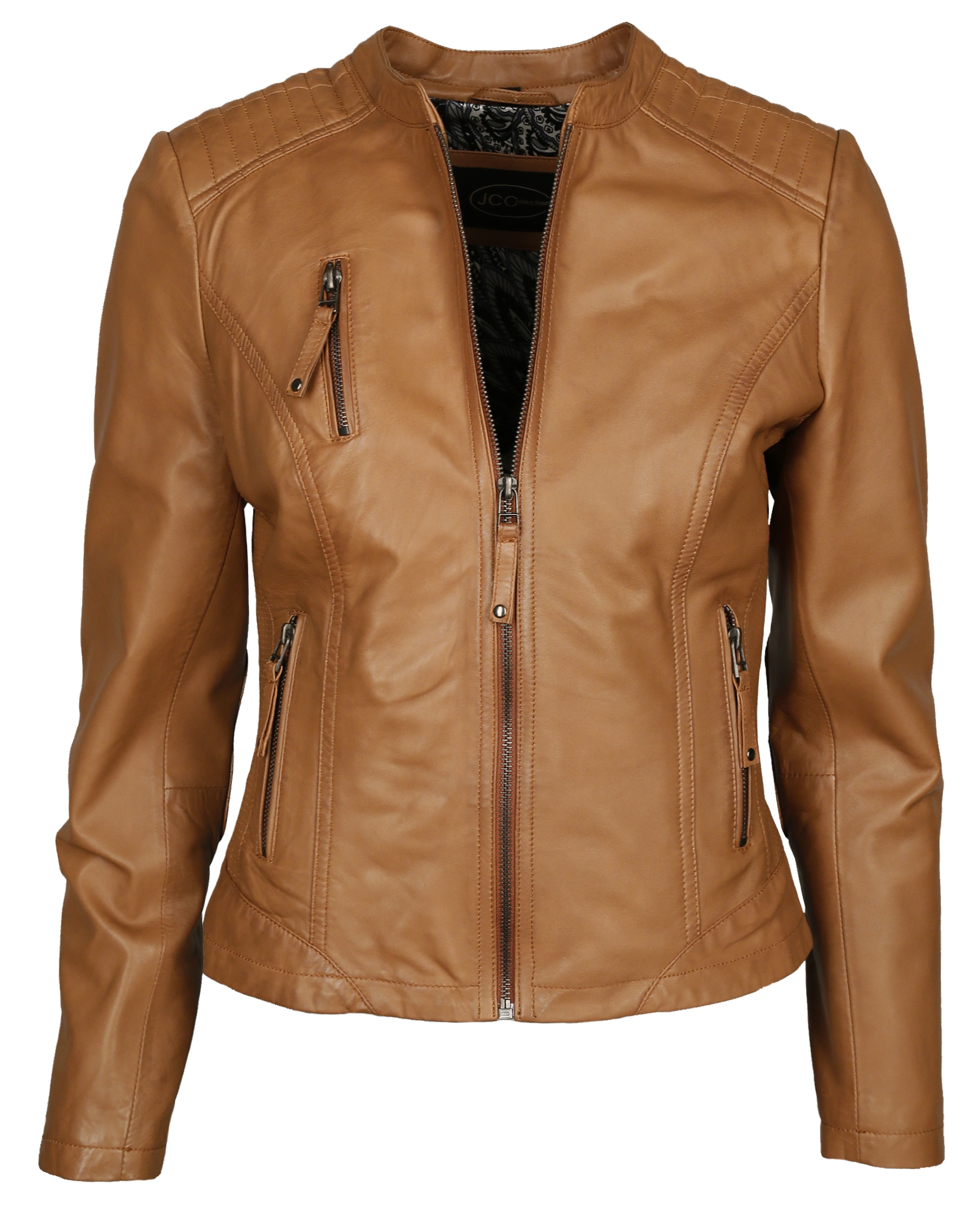 Stilvolle Lederjacke der Modemarke JCC. Die Lederjacke aus weichem Lammleder bietet durch zwei seitliche Einschubtaschen und eine Brusttasche angenehmen Komfort. Ein Highlight der leicht taillierten Jacke ist das aufwendig verzierte Innenfutter. Der Stehkragen und der symmetrische Schnitt runden das Gesamtkonzept der modern stilvollen Jacke ab.