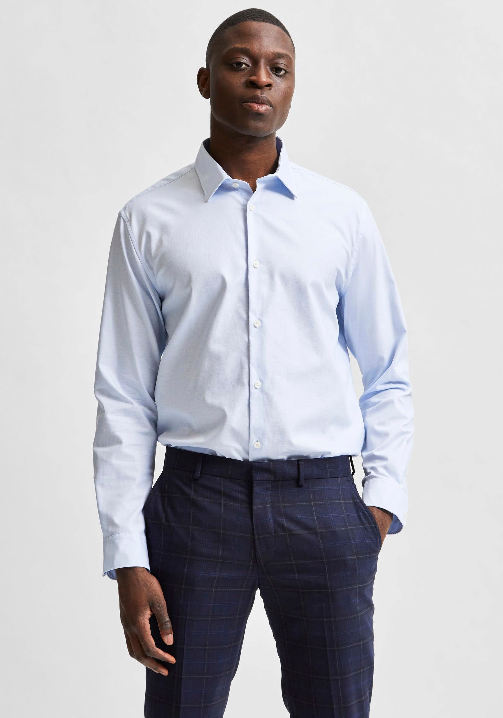Klassisches Herren-Langarmhemd der Marke SELECTED HOMME. Mit einem normalen Schnitt. Kombinierbar für die Arbeit und den Feierabend. Das Oberteil ist durch die weiche Baumwoll-Qualität angenehm zu tragen.