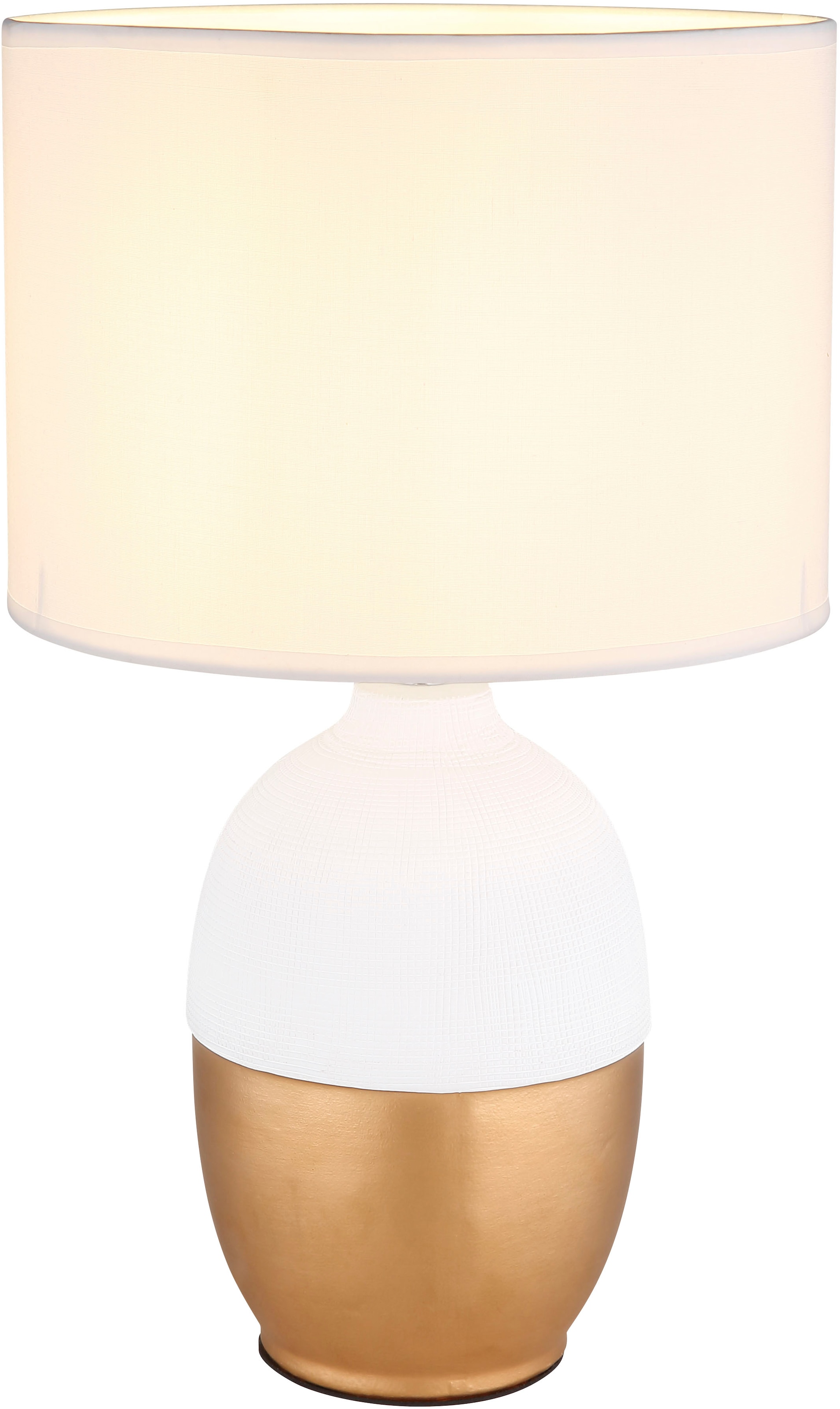 - DIE OPTIK – Diese Tischleuchte kommt in dezentem Weiß und mit einem trendigen Stoffschirm in mehrfarbigem, geometrischen Muster daher.