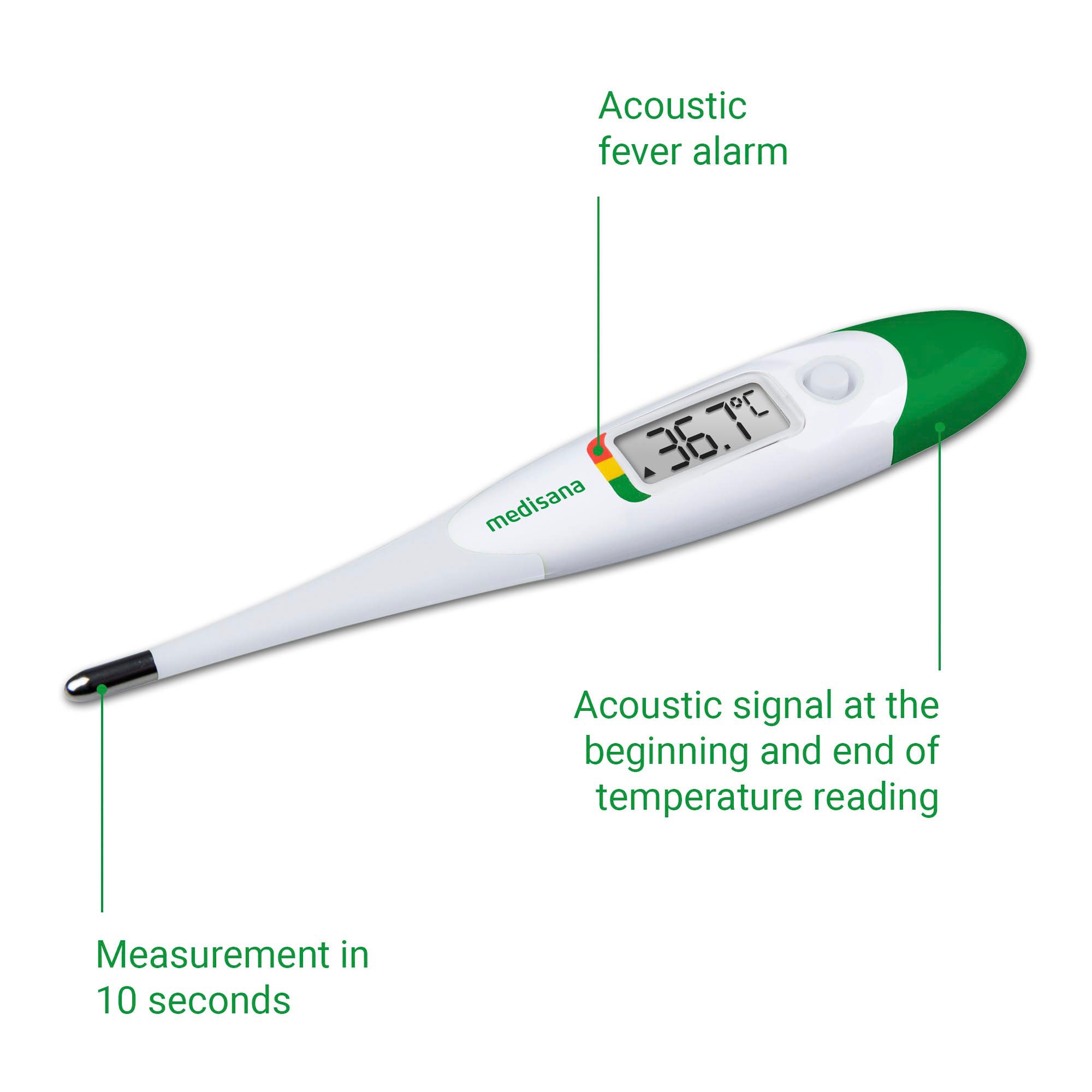 - Akustisches Signal bei Messbereitschaft, bei Fieberalarm und bei Messende