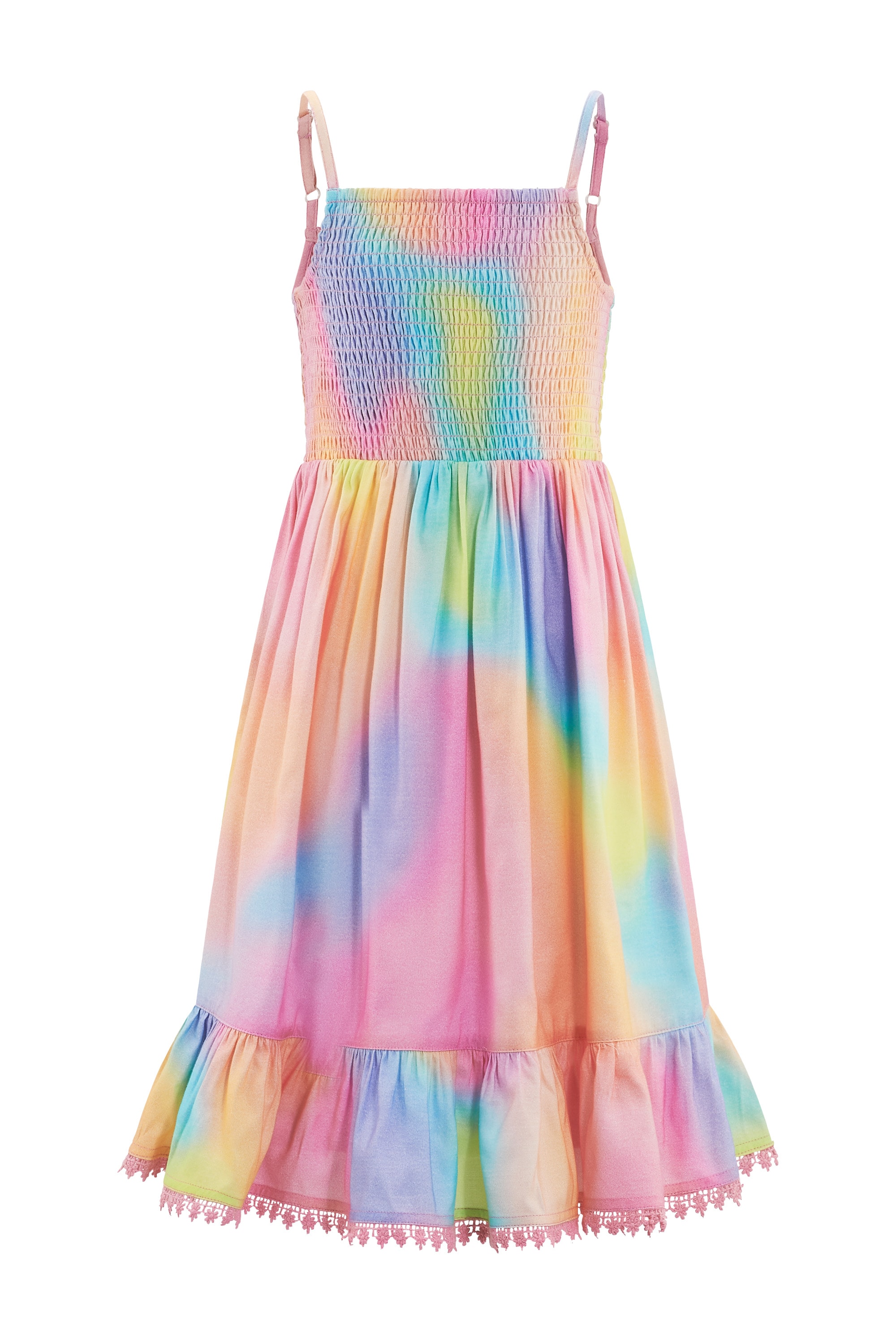 - Gesmoktes Oberteil mit verstellbaren Spaghettiträgern und Volant-Rock
