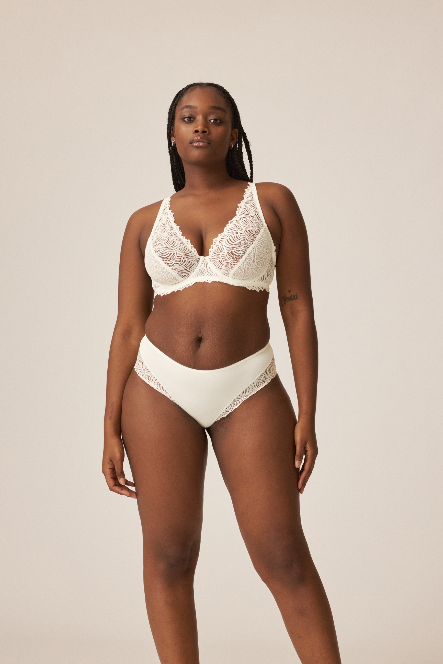Der gesamte BH ist aus Spitze in edlem matt-glanz Dekor gefertigt. Durch die hochgezogenen Träger bietet der genähte Bügel-BH beste Passform. Im Obercup ist die Spitze transparent und ungefüttert, im Untercup dafür blickdicht und zum besseren Halt mit einem Tüll unterlegt.