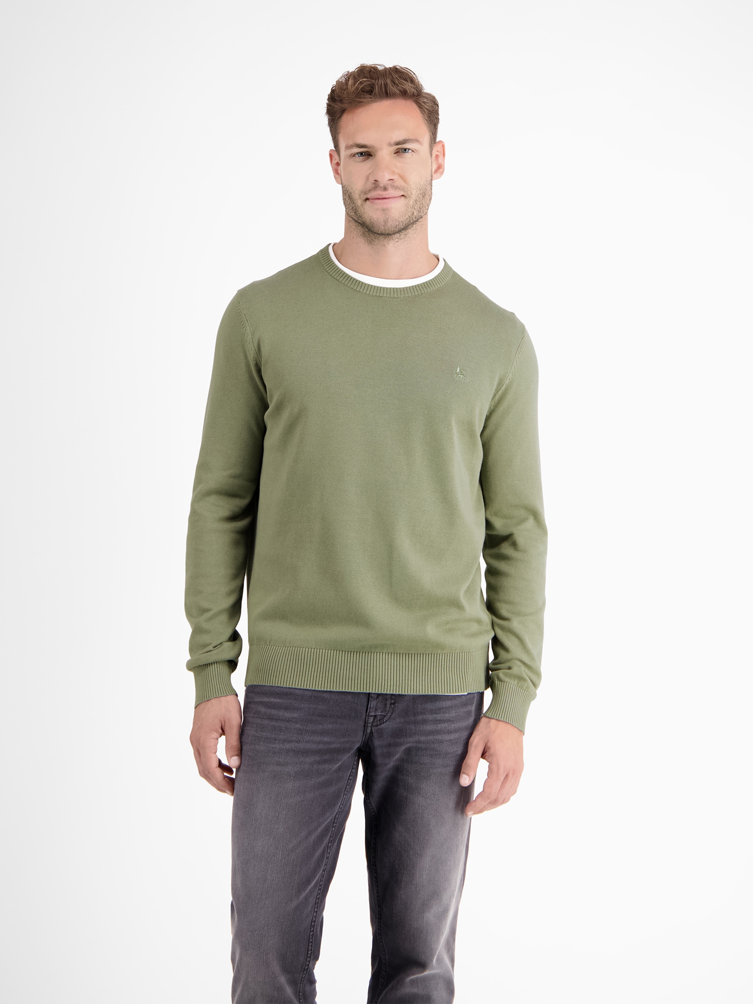 Der klassische Style in nachhaltig produzierter Struktur-Strickqualität von LERROS mit geripptem Rundhalsausschnitt und Saumabschlüssen. Die klassische Schnittführung und der Logostick auf der Brust runden das Design ab.