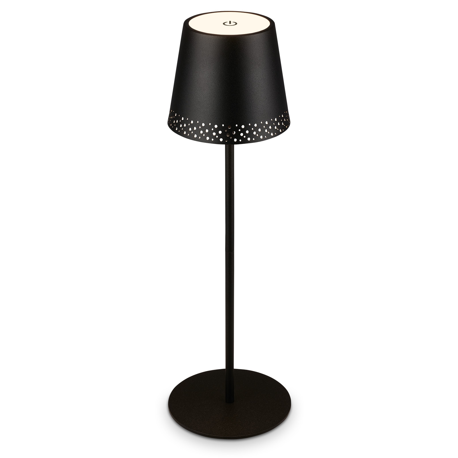 Die LED Lampe wird mit Akku betrieben, was sie zu einer praktischen, kabellosen LED Standlampe in Ihrem Haus macht. Durch die 3-fach teilbare Gewindestange kann die Leuchte auch in der Höhe in Stufen verstellt werden. Damit ist die Stehleuchte auch als Tischlampe einszusetzen. Die Akku Stehlampe lässt sich durch Berührung in drei Stufen dimmen und eignet sich gut als Leselicht, dekorative Stehleuchte im Büro, indirektes Licht im Schlafzimmer und als Licht im Flur. Warmweißes Licht mit einer Farbtemperatur von 3000 Kelvin sorgt für Gemütlichkeit im Schlafzimmer oder auf dem Sofa vor dem Fernseher. Die dimmbare Akku Stehleuchte mit Batterie ist durch die Schutzart IP44 gegen Spritzwasser geschützt, falls sie draußen oder auf dem Balkon oder der Terrasse nass wird. Das mitgelieferte USB-Kabel ermöglicht das Aufladen der 4-Watt LED Lampe. Die Größe der kabellosen Wohnzimmerlampe ist 1300 x 190 mm (HxD) und besitzt einen perforierten Metallschirm. Die Farbe der dimmbaren Dekolampe ist Schwarz.