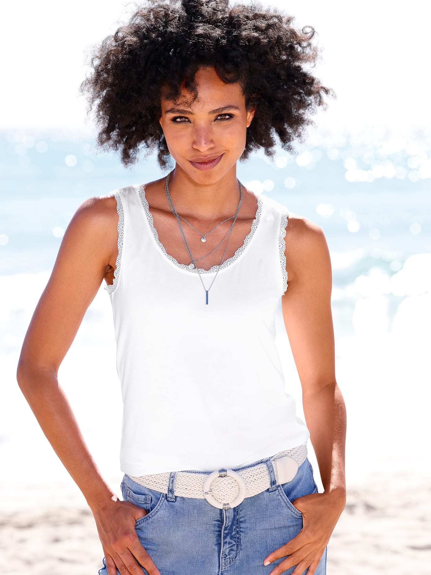 Shirttop Softer Jersey mit femininem Spitzenbesatz. Mit Rundhals-Ausschnitt und breiten Trägern. Viskose in ECOVERO-Qualität von Lenzing. 95% Viskose (ECOVERO), 5% Elasthan. Maschinenwäsche.