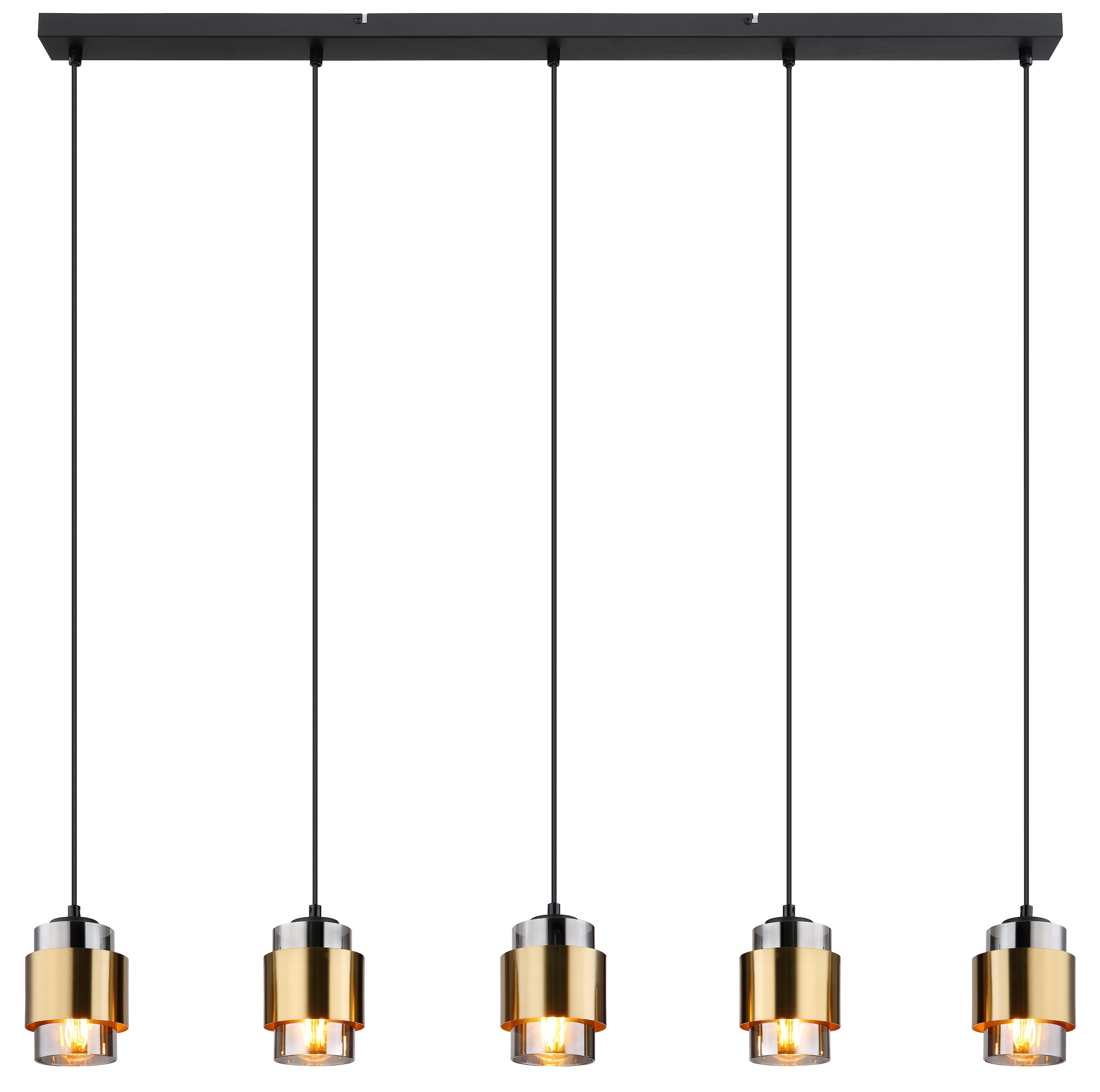 Diese Hängelampe (ø 18 cm) besticht durch ihr ästhetisches Design aus schwarz-mattem Metall und rauchigem Glas. Sie besteht aus einem zylinderförmigen, rauchigem Glasschirm, welcher von einem Messingring umrahmt wird und an einem schwarzen Kabel von der Decke hängt. Die E27-Fassung im Inneren des Schirms können Sie mit einem passenden Leuchtmittel Ihrer Wahl bestücken, wodurch Sie in der Lage sind, Lichtfarbe und Helligkeit nach Ihren Vorstellungen zu bestimmen. Außerdem kann die Höhe der Hängeleuchte bei der Montage auf bis zu 120 cm angepasst werden. Durch weitere Modelle der gleichen Serie können Sie in Ihren Innenräumen stilvolle Akzente setzen und das Gesamtbild komplettieren.