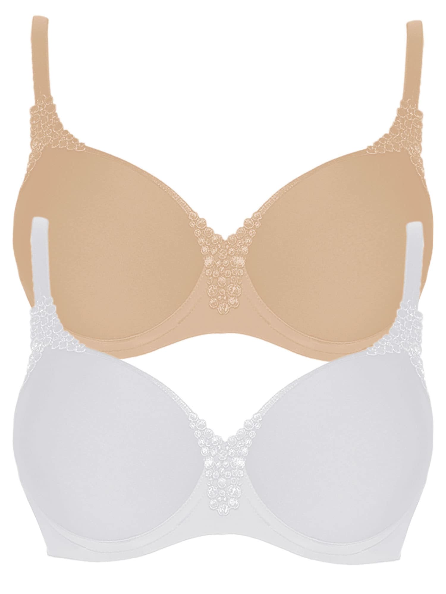 2er Pack Spacer Bügel BH von der Marke VIANIA aus der Serie Carola. Besondere Merkmale des Artikels sind nahtloses Cup, Cup aus atmungsaktivem Spacer-Material, Träger und Steg mit Spitzenverzierung, elastische und weiche Träger und Häkchenverschluss und Träger verstellbar. Viania ist eine deutsche Traditionsmarke seit 1991, spezialisiert auf hochwertige feminine Wäsche und Dessous.