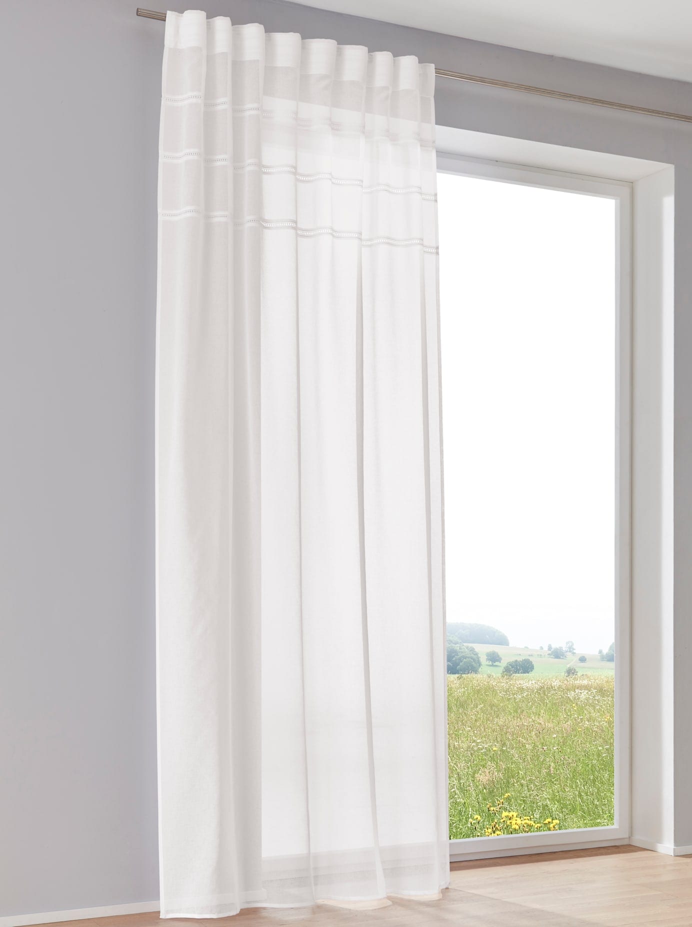 Hinweis Aufhängung | Montageart 1: Aufhängung mittels Gardinenröllchen (nicht im Lieferumfang enthalten) in der Gardinenschiene. Montageart 2: Aufhängung mittels verdeckter Schlaufen an der Gardinenstange. |