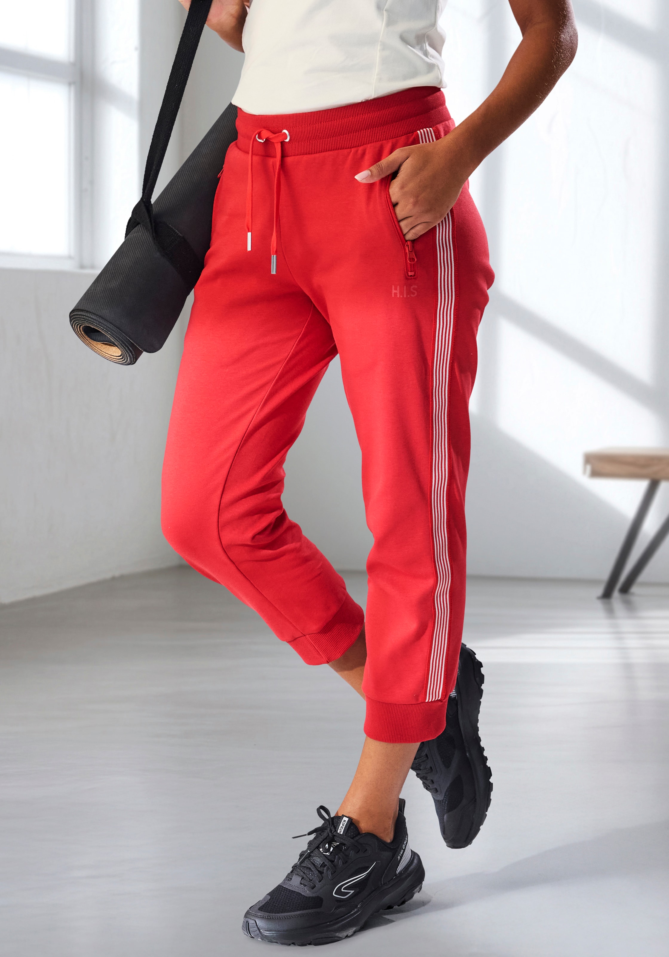 Eng anliegende Performance-Caprileggings von H.I.S mit breitem, bequemem Bund. Markantes Detail: das Streifen-Tape entlang der Hosenbeine. Optimal für Sport und Fitness, aber auch als Homewear oder Basic tragbar. Single-Jersey aus elastischer Baumwolle.