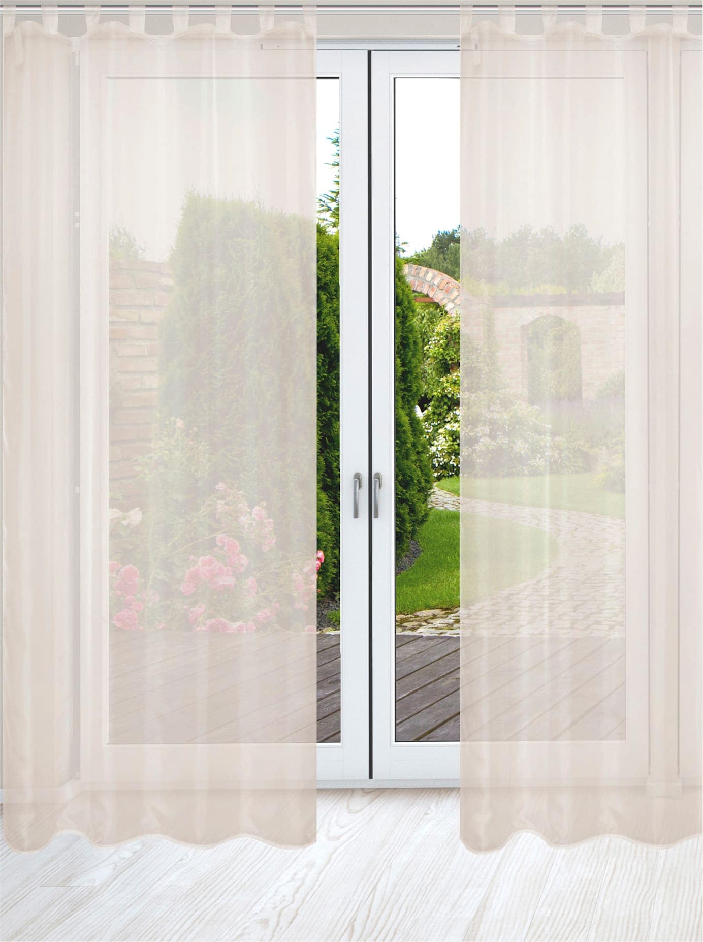 Dekostore 2er-Set. Leichte, transparente Qualität. Mit Schlaufen zur Aufhängung an der Gardinenstange. 100% Polyester. Waschbar.