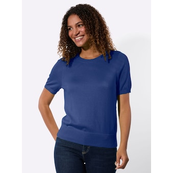 Ein sommerlicher Kurzarm-Pullover aus wunderbar leichtem, trageangenehmen Garn - ideal für alle, die auch in der warmen Jahreszeit nicht auf Maschen verzichten möchten. Der feine Mix aus Ajour- und Pointelle-Muster wird durch zart schimmerndes Effektgarn besonders edel in Szene gesetzt und bringt Modernität ins Spiel. Ein schlichter Rundhals-Ausschnitt und überschnittene Schulterpartien runden den Look entspannt ab.