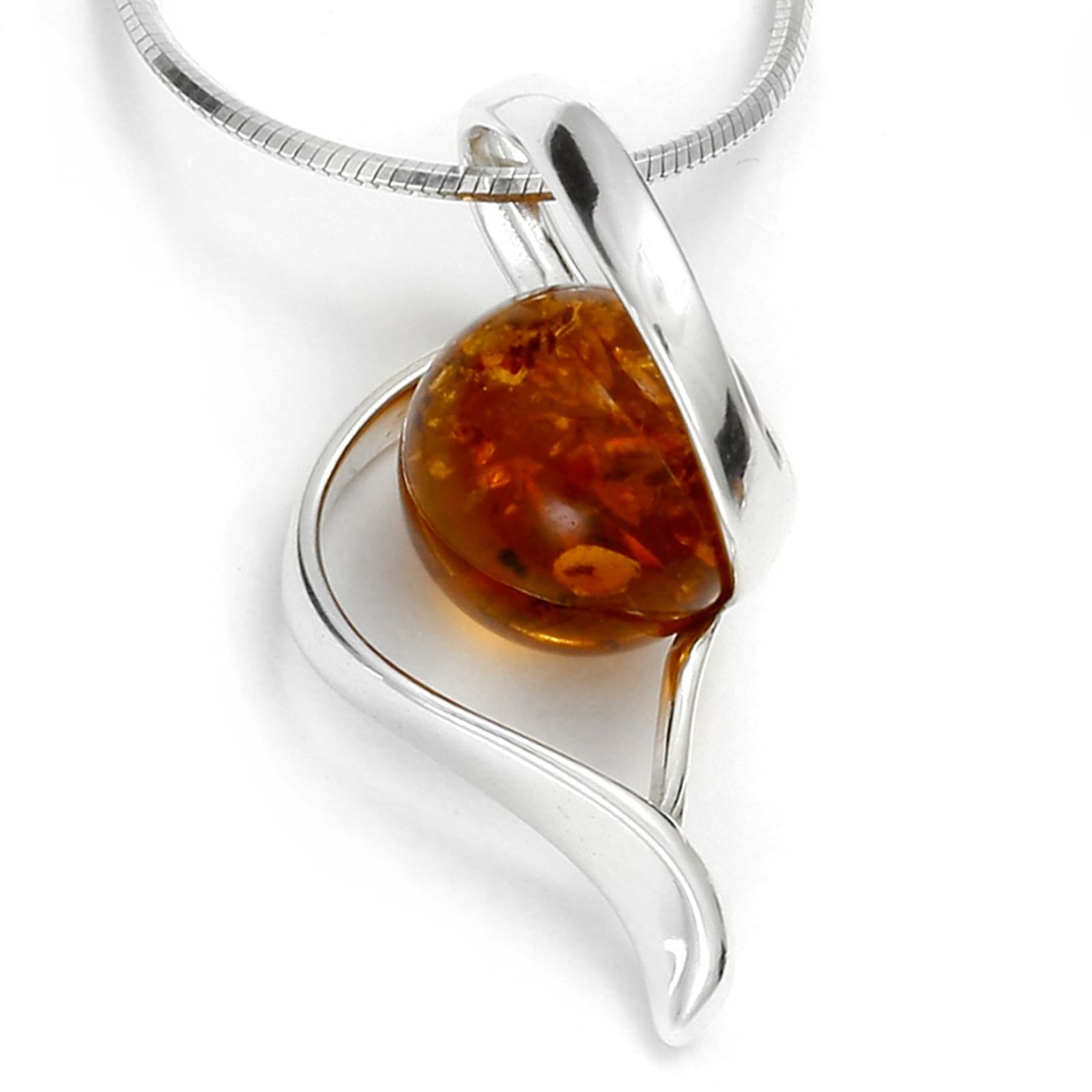 Moderner Bernsteinanhänger aus Sterlingsilber 925/000 mit einem "cognacfarbenen" Bernstein. Der Bernstein hat eine Größe von ca. 23 x 11 mm. Dazu gehört eine 1,3 mm breite und 42 cm bzw. 45 cm lange Panzerkette.