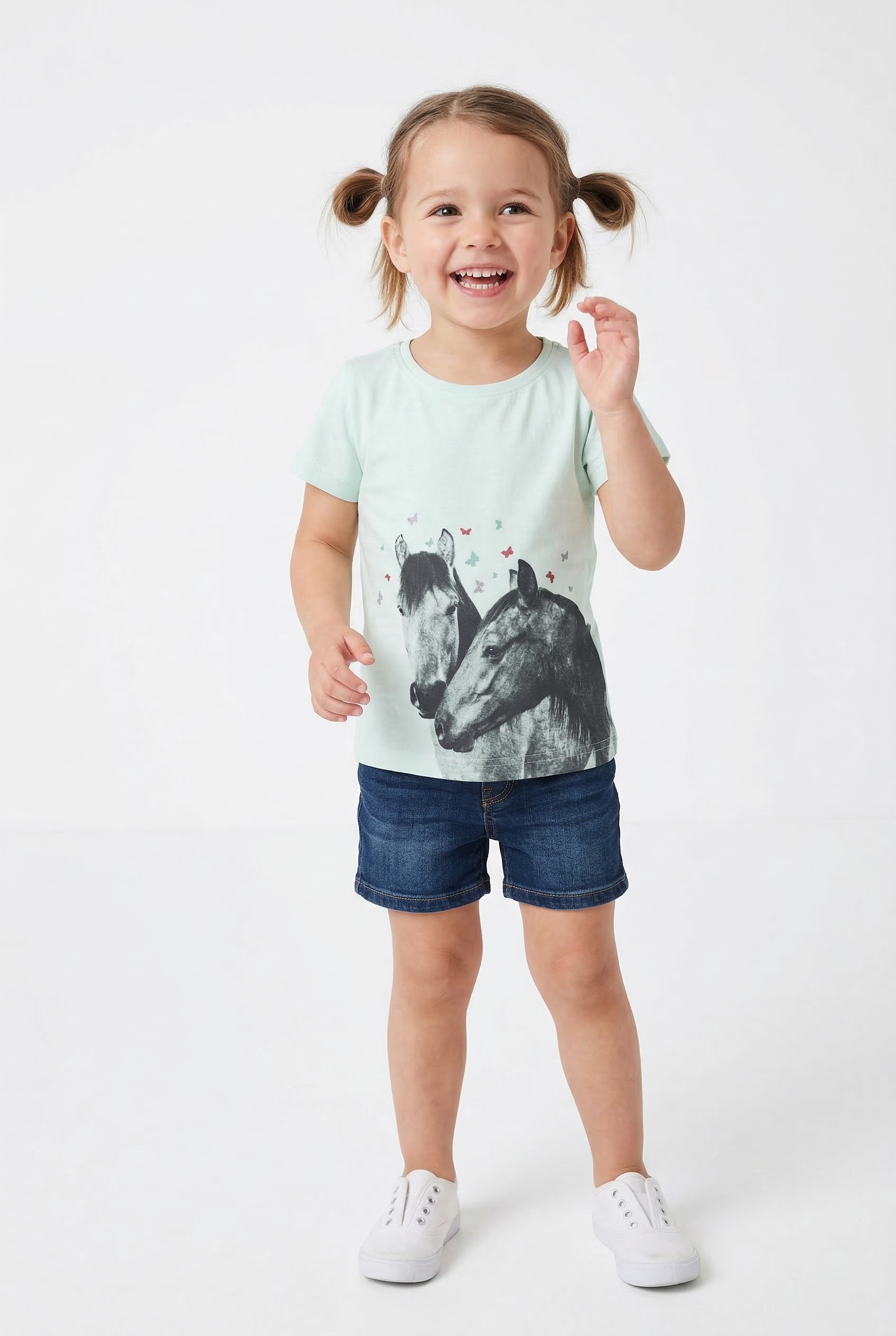 Aktuelles Mädchen-T-Shirt der Marke Blue Seven. Mit einem normal breiten Schnitt. Es ist mit funkelndem Glitzerdruck versehen. Durch die weiche und bewegungsfreundliche Feinripp-Qualität ist das Oberteil angenehm zu tragen.
