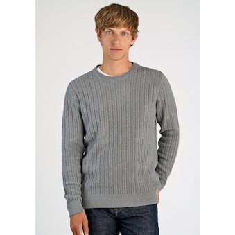 Strickpullover aus einer Baumwollmischung. Der Pullover ist einfarbig und in einem großen Zopfmuster gearbeitet. Der Pullover hat an der Unterseite und an den Ärmelenden Rippstrick. Logo-Patch unten links.