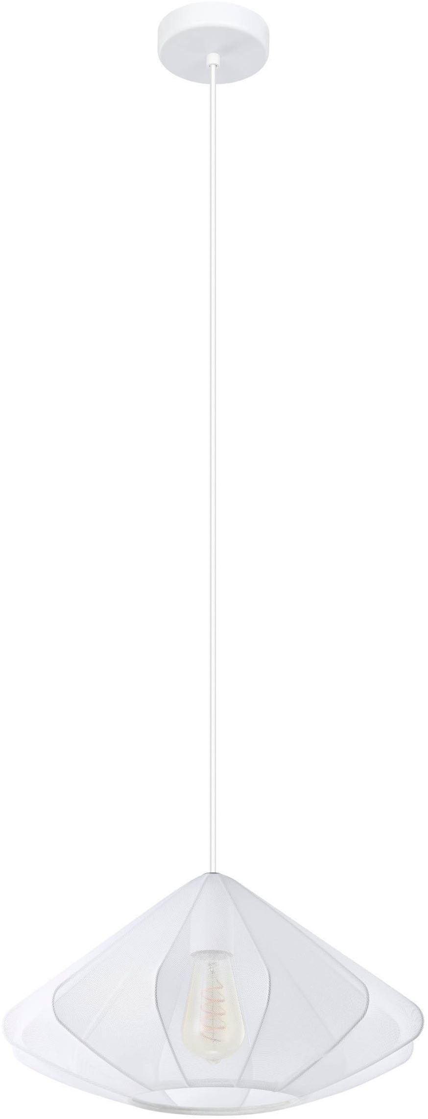Die Hängeleuchte DOLWEN beeindruckt durch ihre elegante Diamant-Form und ihren semi-transparenten Stoff. Dieser Stoff verändert je nach Lichtfarbe des eingesetzten Leuchtmittels seinen Look, wodurch unterschiedliche Stimmungen im Raum erzeugt werden können. Die Leuchte fügt sich nahtlos in moderne Einrichtungsstile ein und wird zu einem stilvollen Blickfang über jedem Esstisch, in der Küche oder im Wohnzimmer. Das abgebildete Leuchtmittel ist nicht im Lieferumfang enthalten. Geeignet ist die Leuchte für jedes Leuchtmittel mit E27-Sockel.