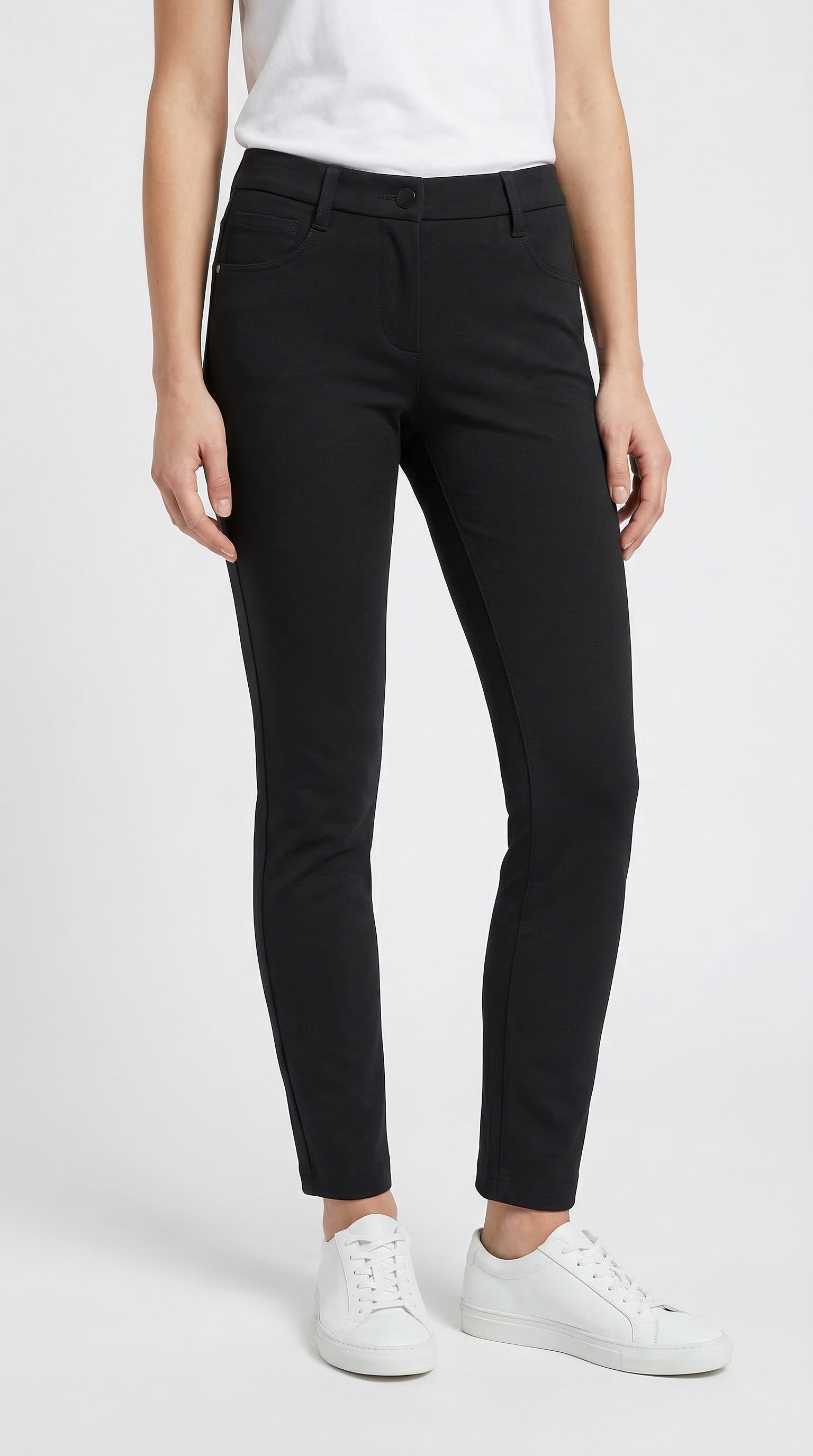 Moderner Chic trifft jede Menge Komfort. Diese Hose verbindet stilvoll inszenierte Sportivität mit innovativer Material-Qualität. Der schlanke Schnitt aus super elastischer Techno-Ware bietet maximale Bewegungsfreiheit und sorgt für ein Erscheinungsbild von modisch gepflegtem, urbanem Chic. Die trageangenehme Beschaffenheit ist ideal für dynamische Alltagsmomente. Die klassische 4-Pocket-Form wird an den vorderen Taschen von dekorativen Reißverschlüssen akzentuiert, die coolen Glanz in den Look bringen. Der Formbund mit Gürtelschlaufen sitzt komfortabel auf der Hüfte und sorgt zusammen mit der gerundeten Rückenpasse für optimalen Sitz und eine schmeichelnde Passform. Ob casual oder elegant: Diese Hose bringt Frische und Modernität in die Szenerie und punktet mit hohem Tragekomfort.