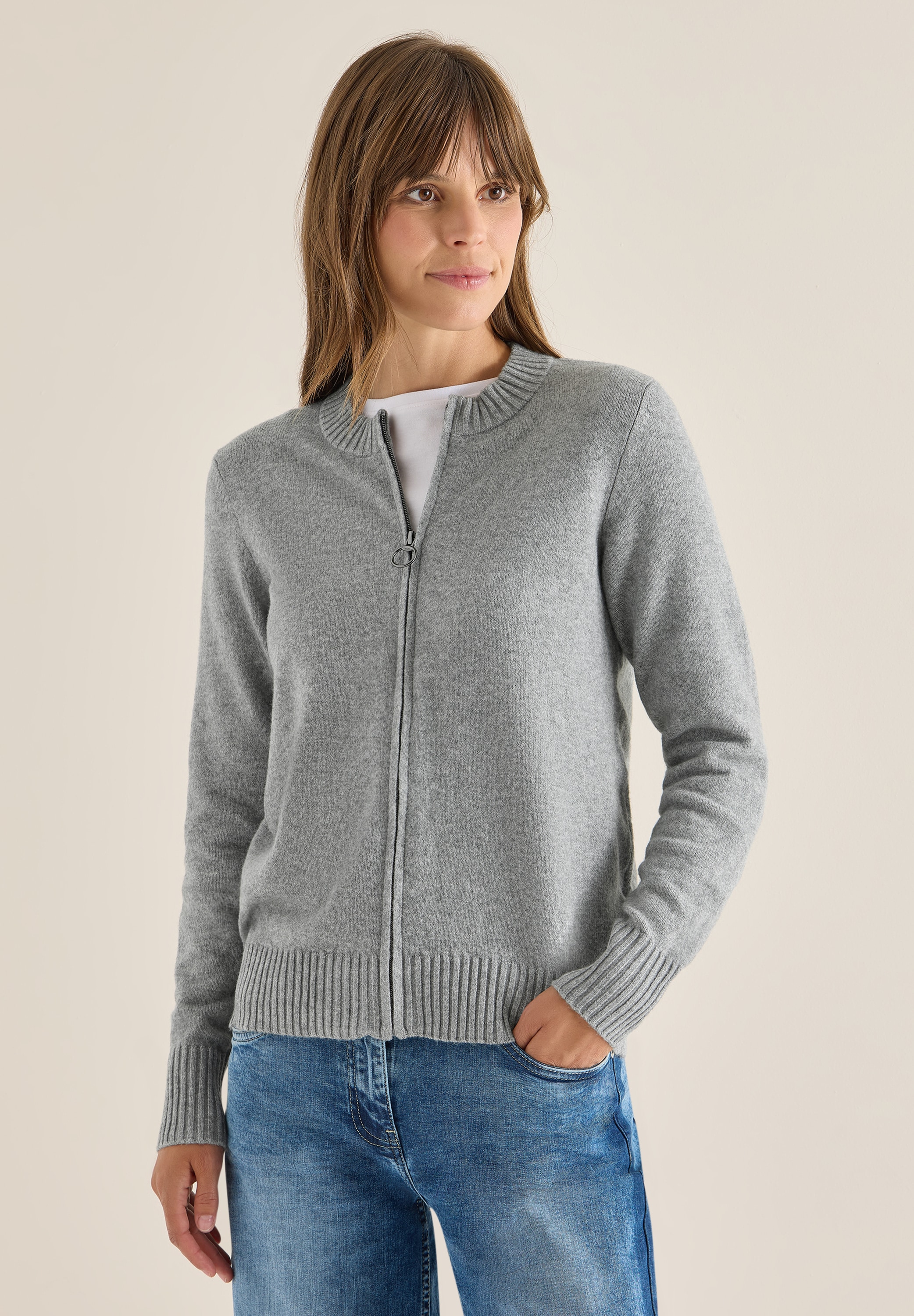 Die Strickjacke von CECIL für Damen kombiniert sportiven Stil mit gemütlichem Komfort – dank softem Baumwollmix und praktischem Reißverschluss. Der Rundhalsausschnitt und die Rippbündchen an den Ärmeln runden das Design ab. Perfekt für einen lässigen Look, der sich unkompliziert im Alltag tragen lässt.