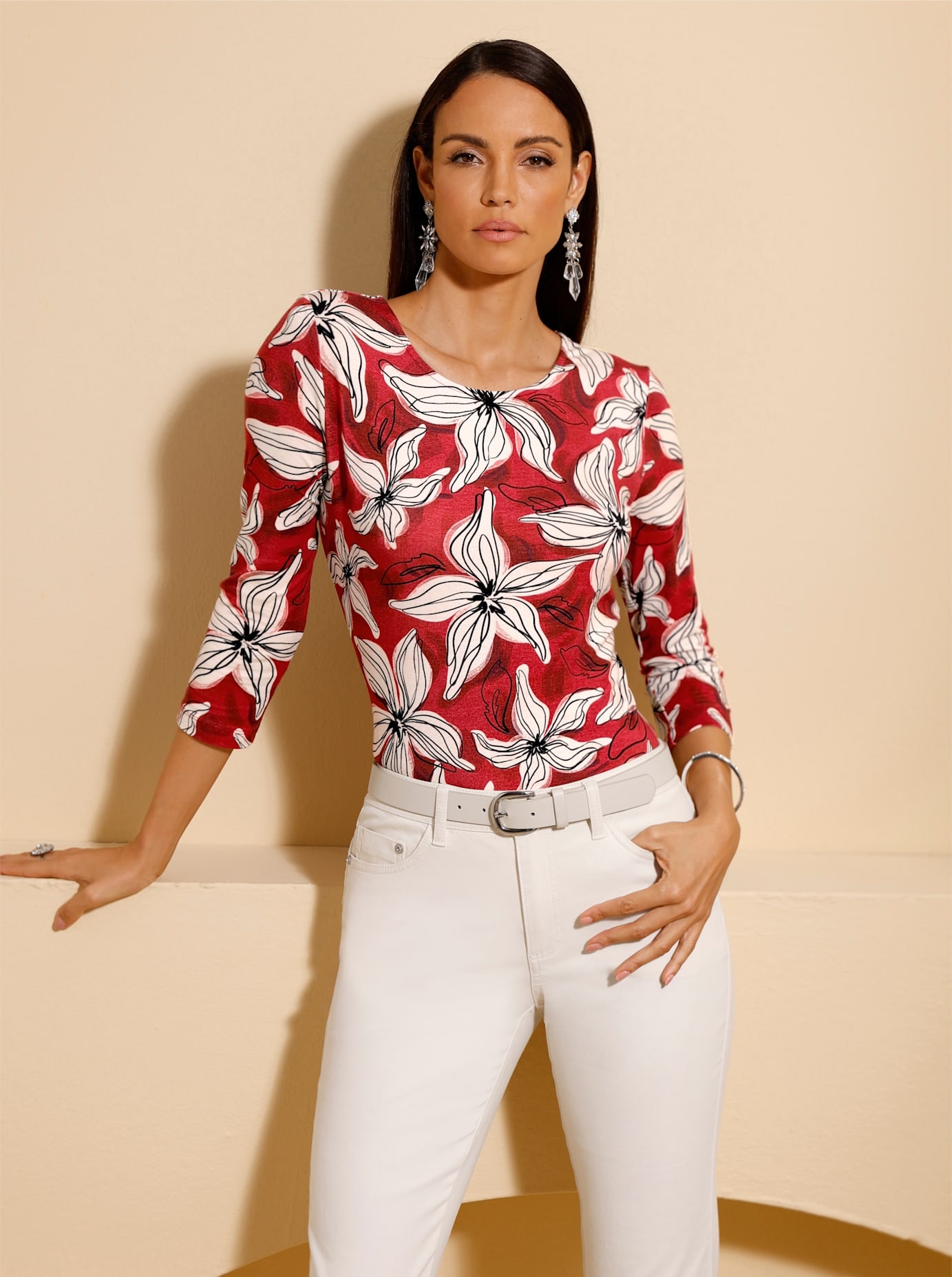 Blütenzauber trifft auf Viskose in ECOVERO-Qualität von Lenzing: Shirt mit Rundhals-Ausschnitt und beliebten 3/4-Ärmeln. 95% Viskose (ECOVERO), 5% Elasthan. Maschinenwäsche.