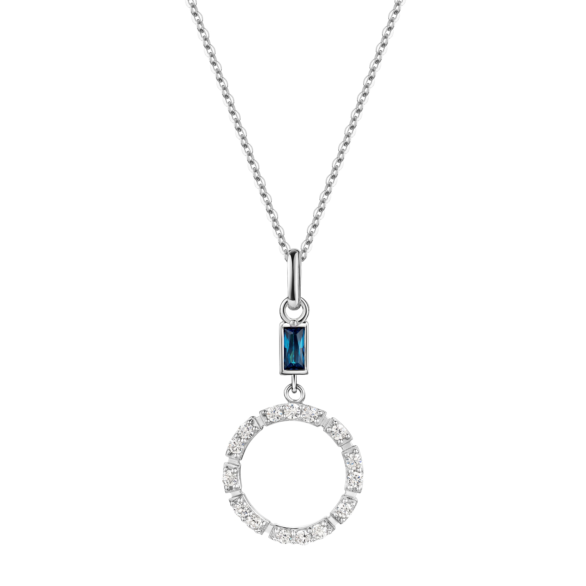 - Mit einem funkelnd dunkelblauen und kristallweißen Zirkonia (synth.)