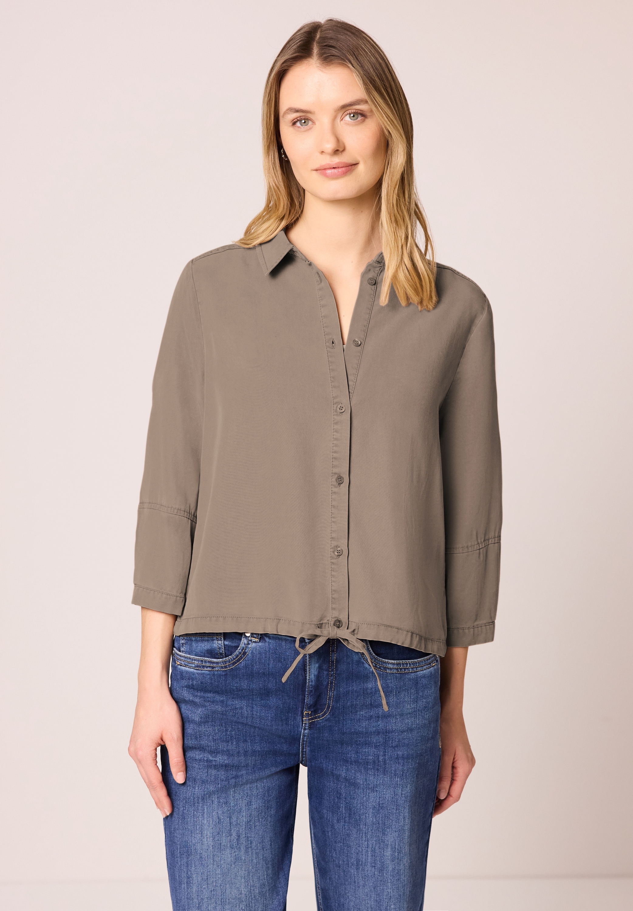 Klassische Damen-Hemdbluse der Marke STREET ONE. Mit einem hüftbedeckenden und lässig geschnittenen Schnitt. Die Ärmel sind 3/4-lang. Sie ist mit einem verspielten Bindeband versehen. Durch den leichten Webstoff fühlt sich das Oberteil luftig auf der Haut an.