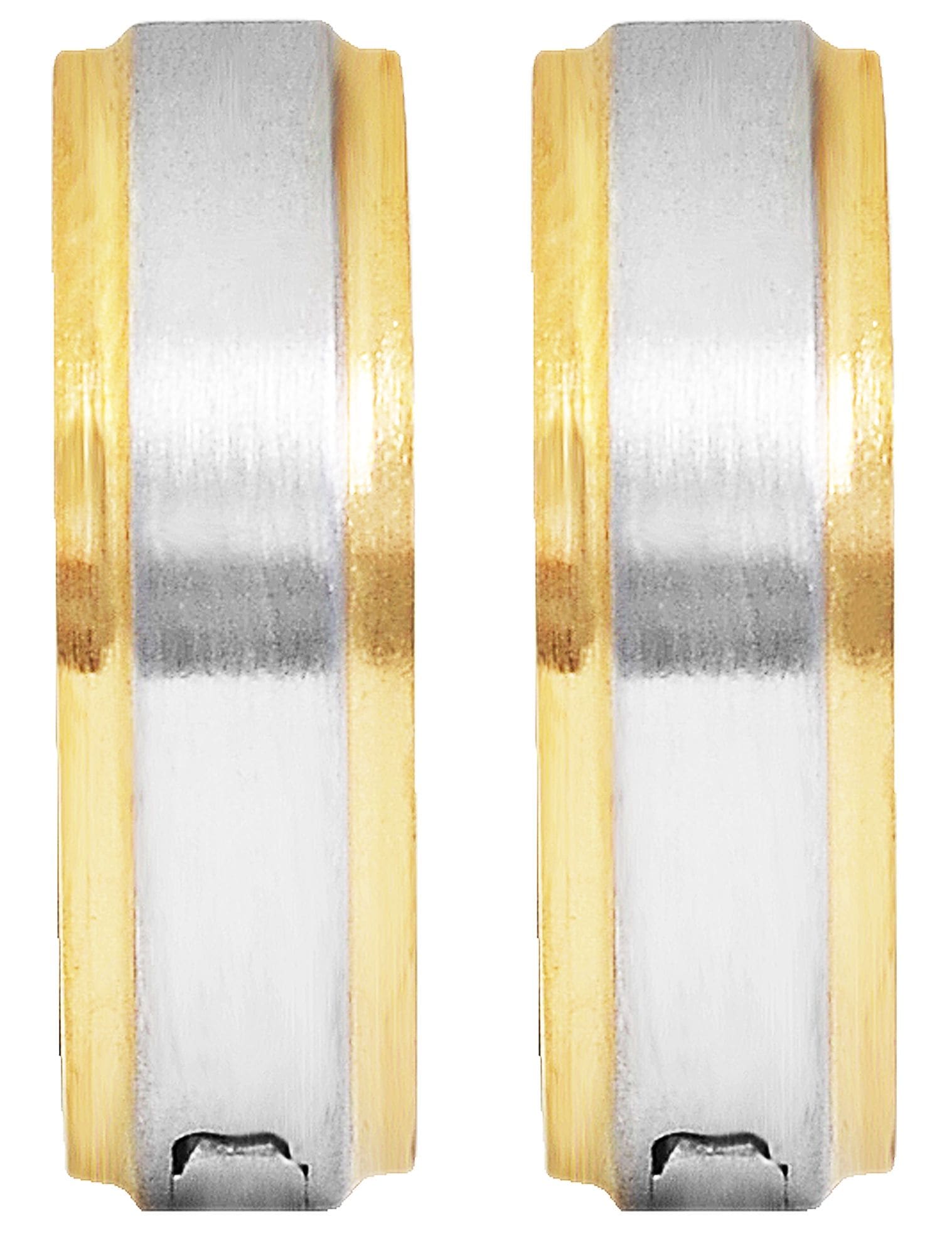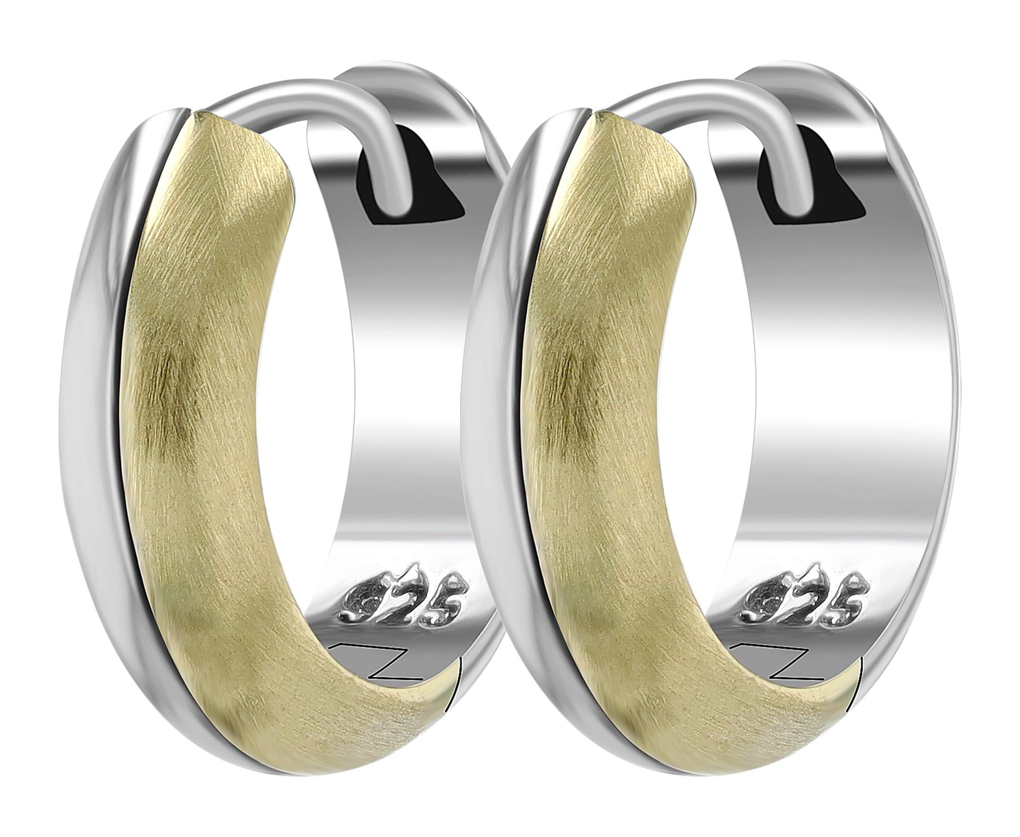 Die Creolen sind aus Edelstahl gefertigt. Sie sind zweifarbig gehalten und zeigen sich in mattierter und polierter Optik. Die silberfarbene Fläche ist mattiert und die goldfarbenen Streifen sind poliert. Auch die Außenkanten erstrahlen in goldfarbenem Edelstahl. Dieses Design verleiht den Klapp-Creolen eine besondere Optik und macht sie somit zu einem tollen Highlight. Die Maße ergeben sich aus einem Durchmesser von 9,5 mm, einer Breite von 6 mm und einer Materialstärke von 2 mm.