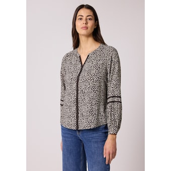 Diese Tunika von Street One für Damen setzt mit Tape-Details im Leo-Look modische Akzente. Der Split Neck und der leicht gerundete Saum verleihen dem Design eine lässige Silhouette. Aus weicher Viskose gefertigt, bietet sie ein angenehm leichtes Tragegefühl – perfekt für feminine Everyday-Looks.