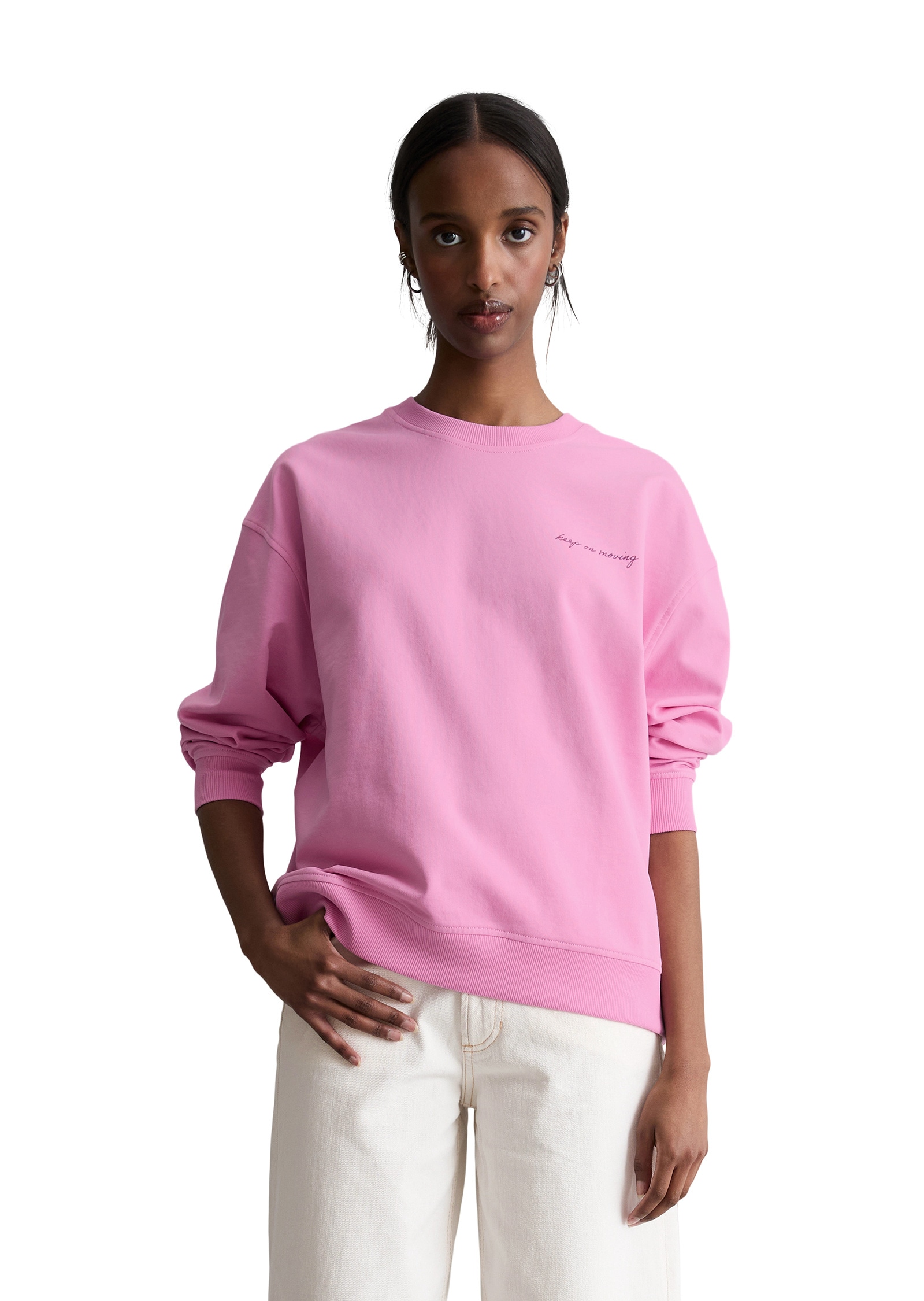 Designed for Circularity. Es handelt sich dabei um Produkte, die so konzipiert sind, dass alle Komponenten recycelbar sind. Es steht für den absoluten Casual-Look und ist jetzt auch officetauglich: das superlässige DfC-Sweatshirt von Marc O’Polo DENIM! In Kombination mit einer weiten Hose entsteht eine lässige, fließende Silhouette, während es in Kombination mit einer schmalen Jeans eher für einen kontrastreichen Look sorgt. Es besteht aus reiner Bio-Baumwolle, hat einen klassischen Rundhalsausschnitt mit der charakteristischen Dreiecks-Flatlock-Naht vorne und ist an den Raglanärmeln und am Saum mit markanten Rippstrickbündchen versehen. Ein echter Eyecatcher ist die hochwertige, farblich abgestimmte Stickerei auf der Brust. Der Schnitt ist locker mit einer Teilungsnaht am Ärmel. Die Qualität: reine Bio-Baumwolle in einer Open Structure Terry Sweat-Qualität.